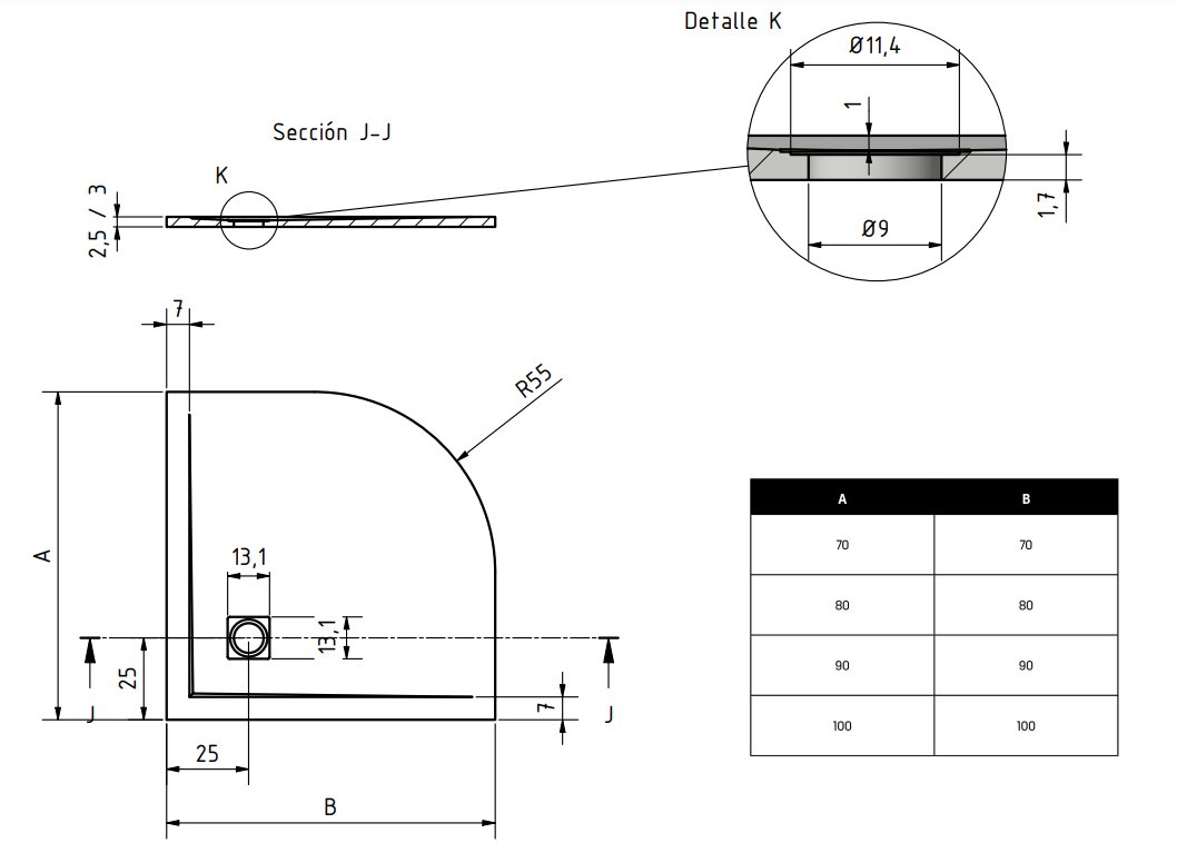 De ZEZA Grade douchevloer meet 90cm in lengte en 90cm in breedte, met een comfortabele hoogte van slechts 3 cm voor gemakkelijke toegang. Het product is uitgerust met een zelfdragend frame, maar wordt geleverd zonder afvoer en poten. De diameter van het afvoergat bedraagt 90 mm, ideaal voor standaard afvoersystemen.