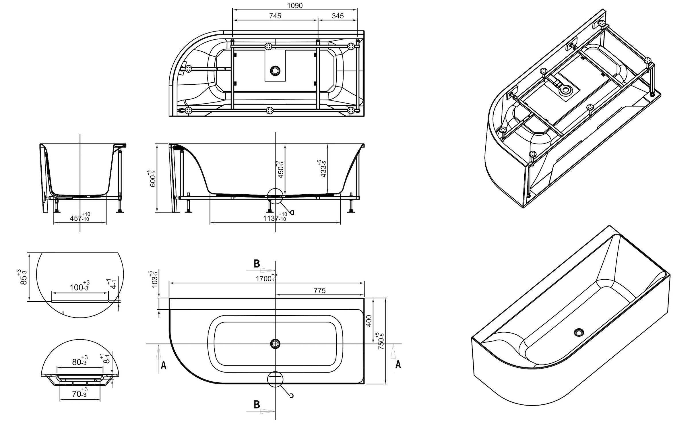 Wiesbaden Zenn hoekbad rechts 170x75cm acryl glans wit met waste glans wit