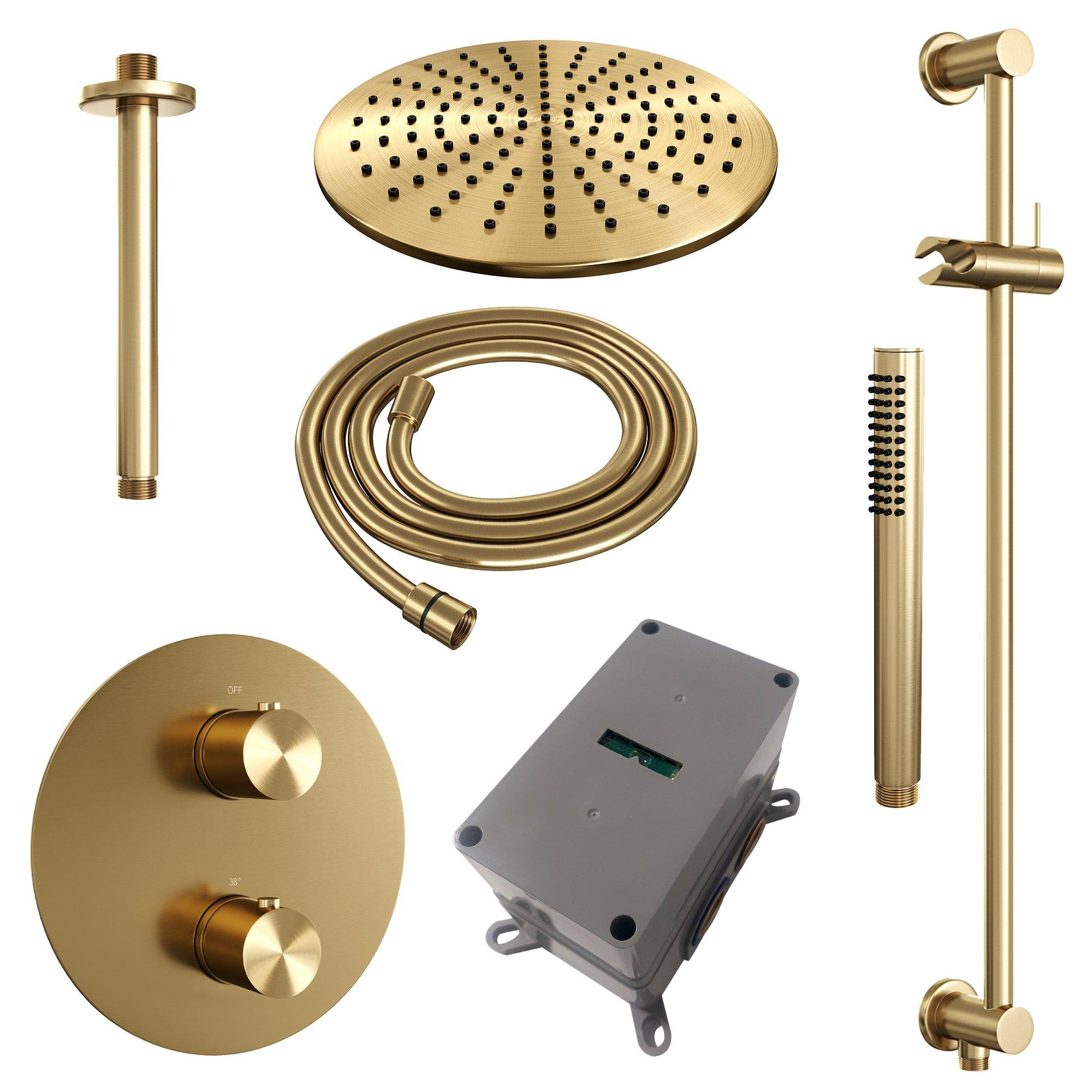 BRAUER Gold Edition thermostatische Inbouw Regendouche - 3-weg - rond - set 90 - 30cm hoofddouche - plafondarm - staaf handdouche - doucheslang - geïntegreerde glijstang - goud geborsteld PVD