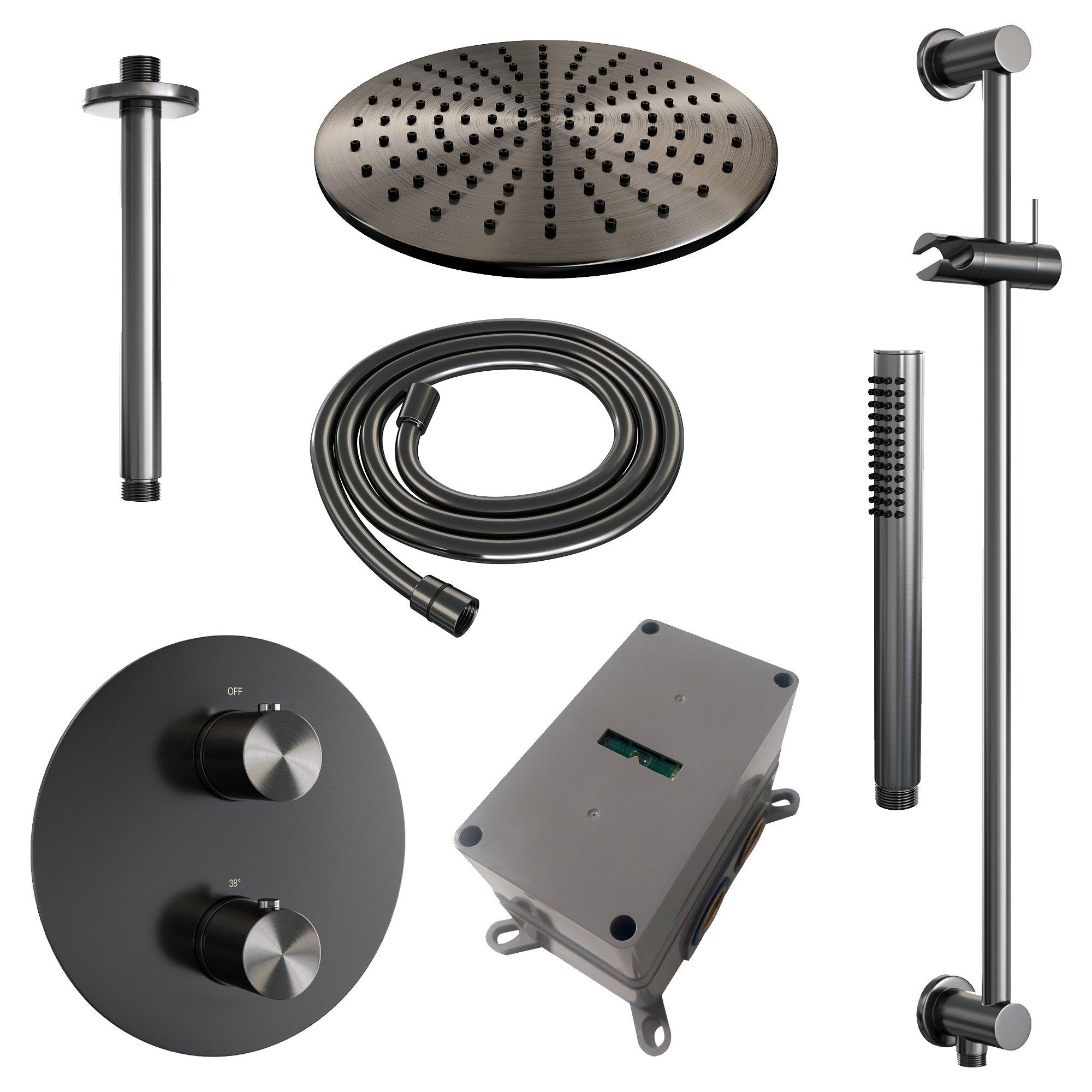 BRAUER Gunmetal Edition thermostatische Inbouw Regendouche - 3-weg - rond - set 90 - 30cm hoofddouche - plafondarm - staaf handdouche - doucheslang - geïntegreerde glijstang - gunmetal geborsteld PVD