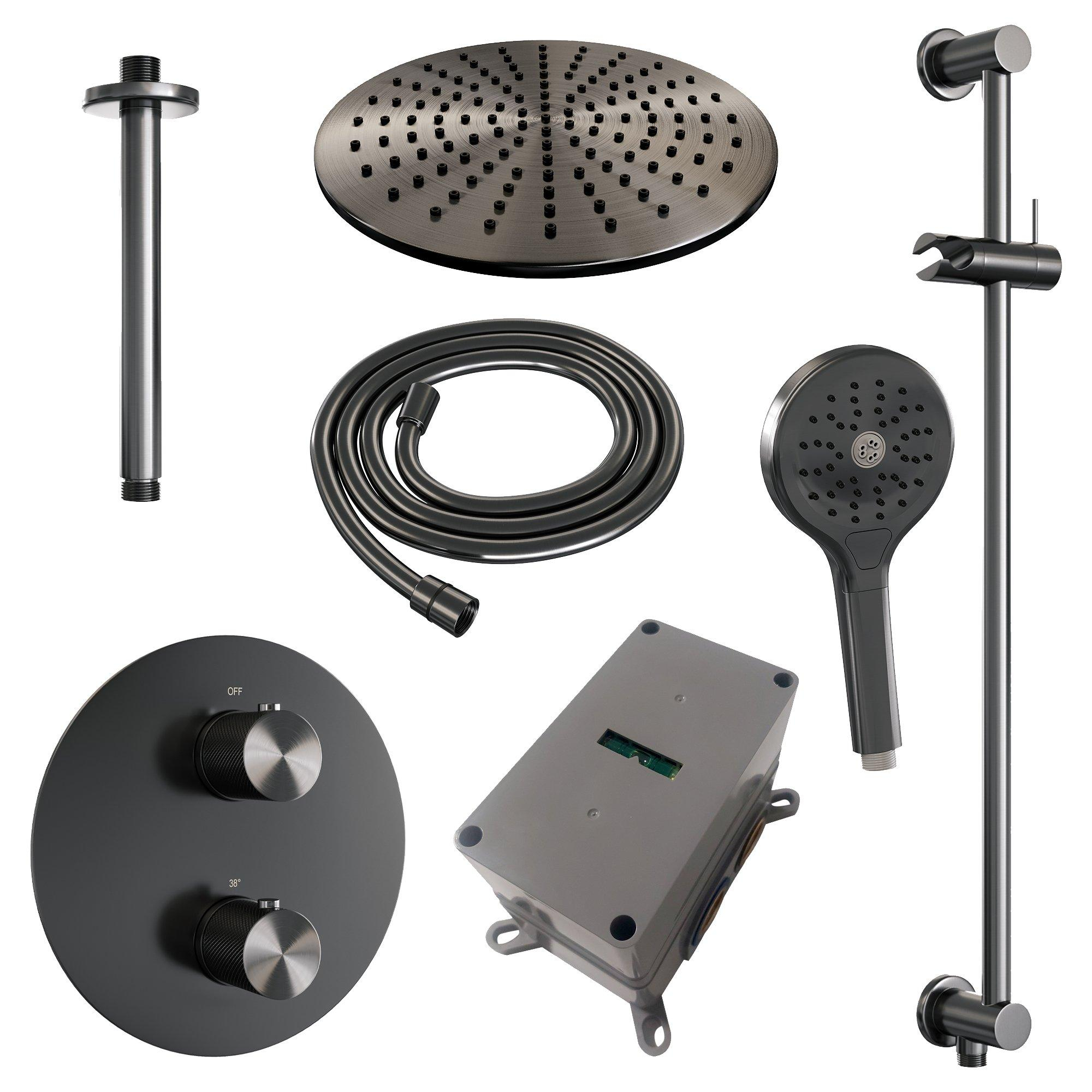 BRAUER Gunmetal Carving thermostatische Inbouw Regendouche - 3-weg - rond - set 96 - 30cm hoofddouche - plafondarm - 3-standen handdouche - doucheslang - geïntegreerde glijstang - gunmetal geborsteld PVD