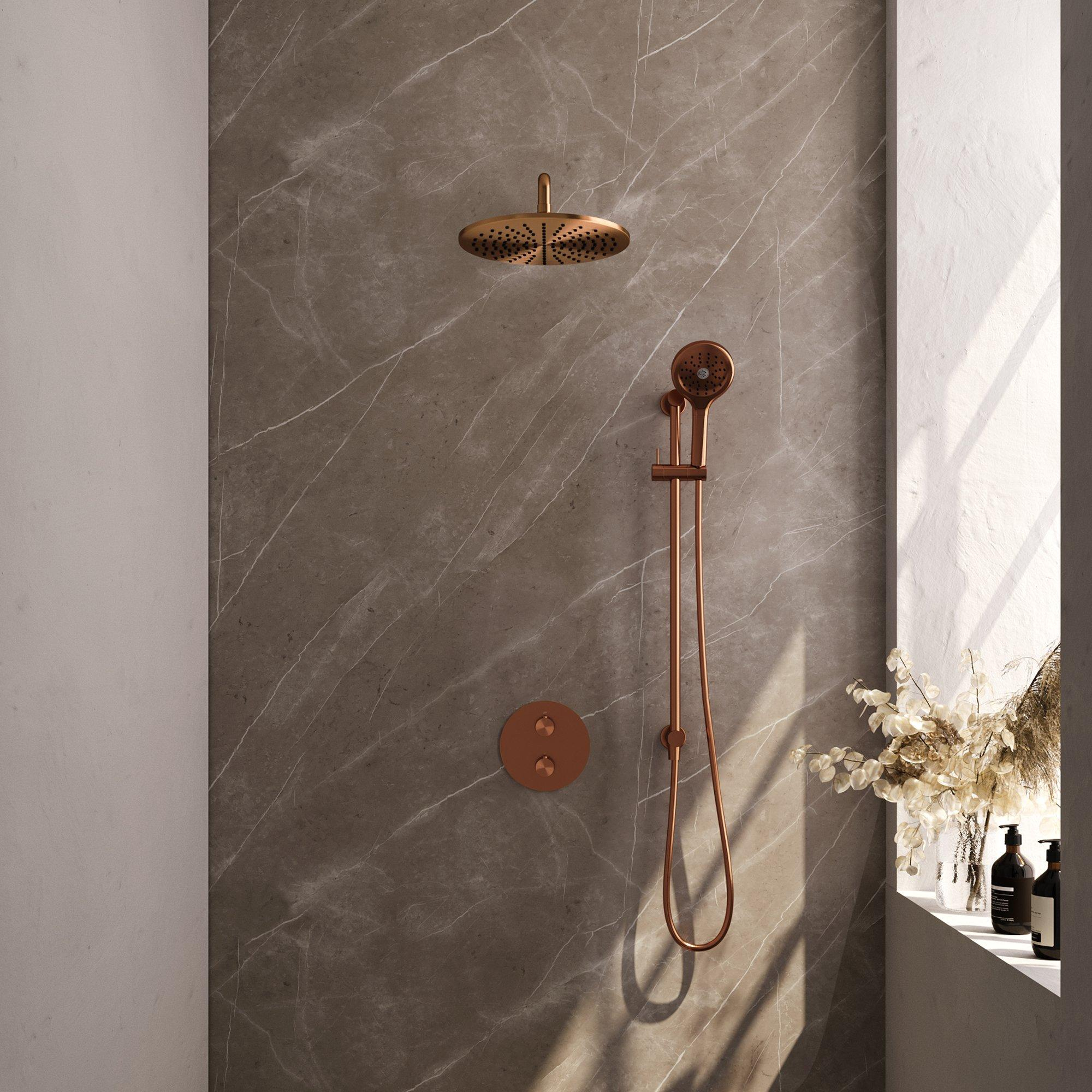De BRAUER Copper Carving thermostatische Inbouw Regendouche is een prachtig ontworpen doucheset die een vleugje luxe en elegantie toevoegt aan elke badkamer. Met zijn koperen geborstelde PVD-afwerking straalt deze regendouche klasse en stijl uit. De set bestaat uit een 30cm hoofddouche met een gebogen muurarm, een 3-standen handdouche en een geïntegreerde glijstang. Geniet van een ontspannende douche-ervaring met deze hoogwaardige en functionele regendouche.