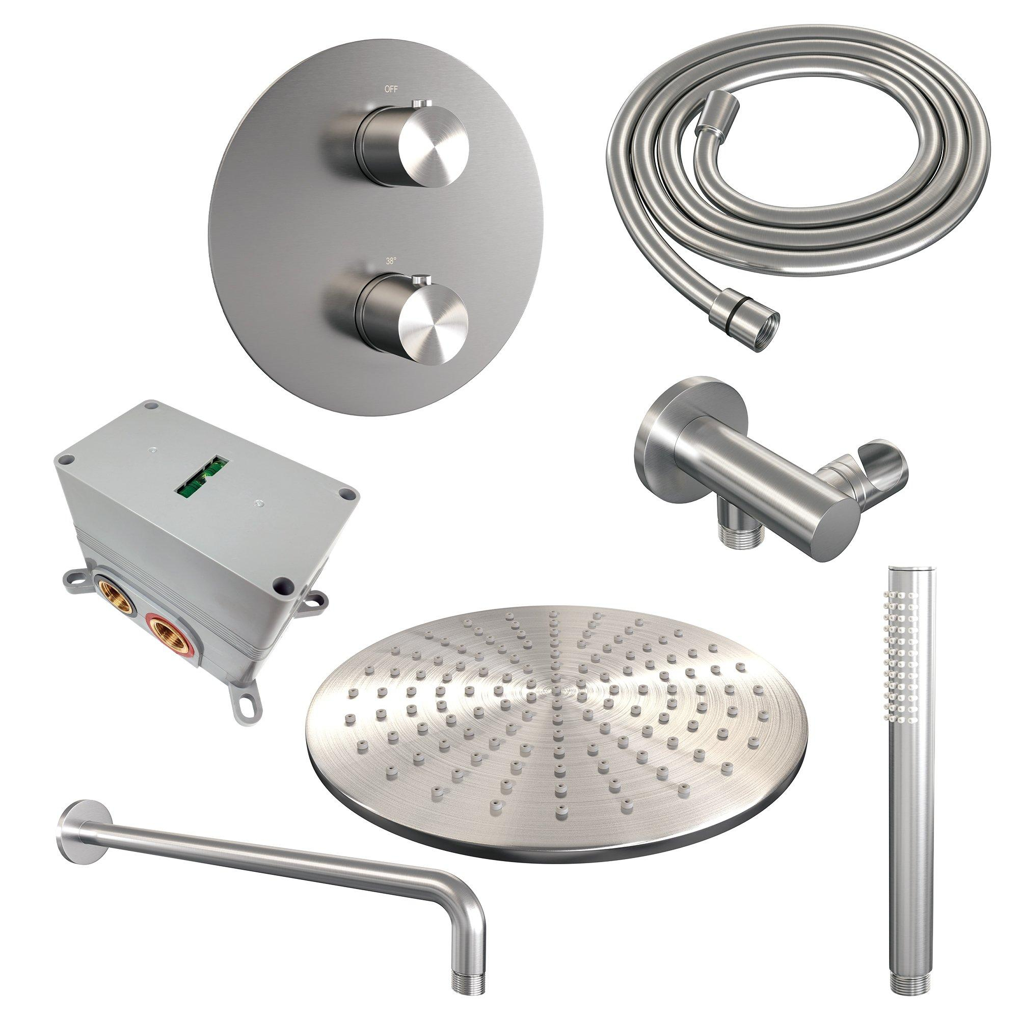 BRAUER Brushed Edition thermostatische Inbouw Regendouche - 3-weg - rond - set 76 - 30cm hoofddouche - gebogen muurarm - staaf handdouche - doucheslang - wandaansluitbocht - RVS geborsteld PVD