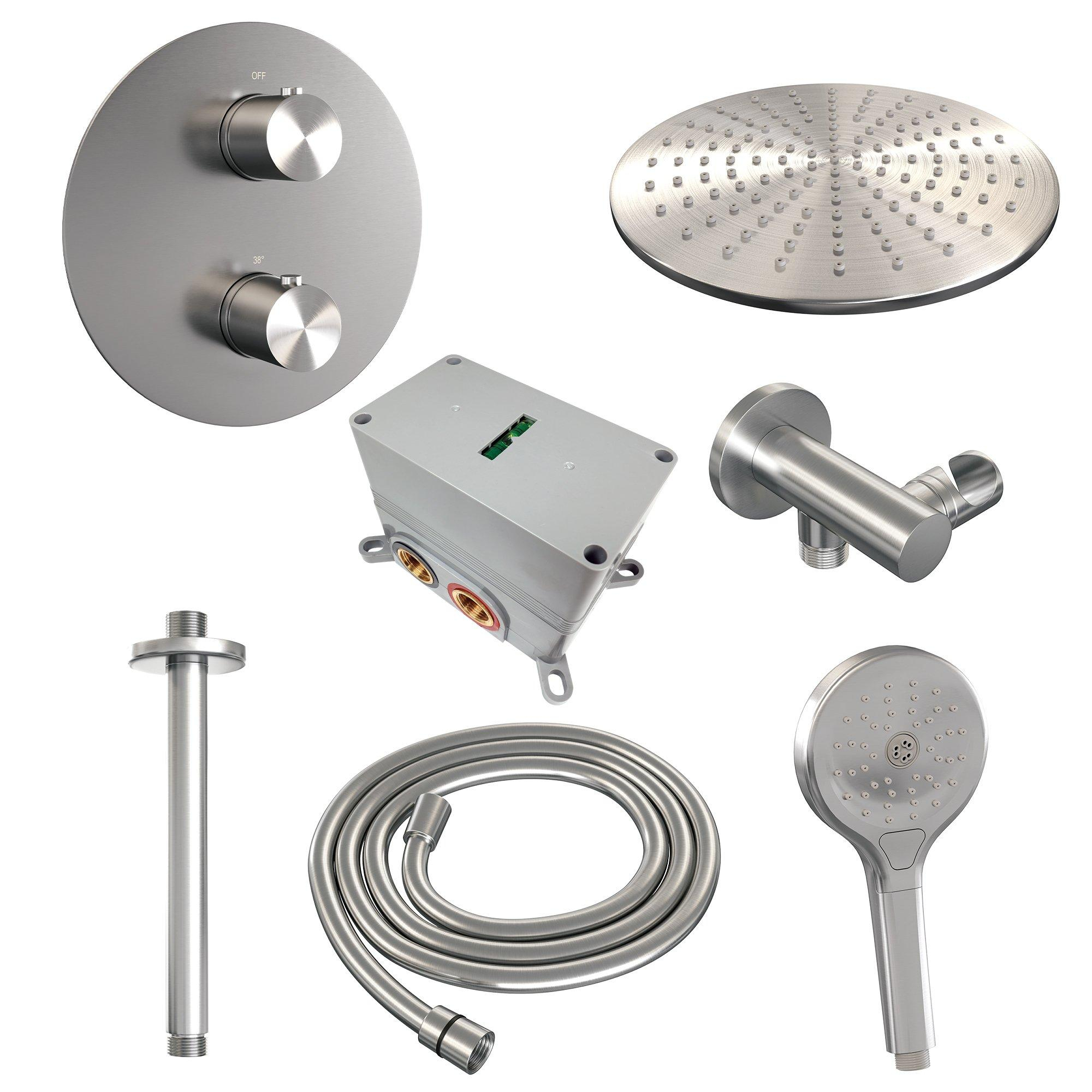 BRAUER Brushed Edition thermostatische Inbouw Regendouche - 3-weg - rond - set 84 - 30cm hoofddouche - plafondarm - 3-standen handdouche - doucheslang - wandaansluitbocht - RVS geborsteld PVD
