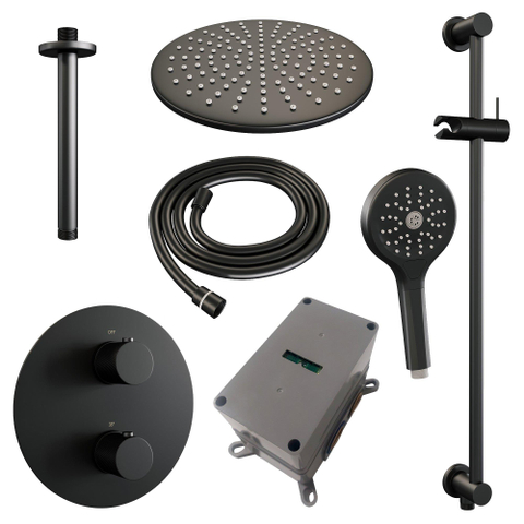 BRAUER Black Carving thermostatische Inbouw Regendouche - 3-weg - rond - set 96 - 30cm hoofddouche - plafondarm - 3-standen handdouche - doucheslang - geïntegreerde glijstang - mat zwart