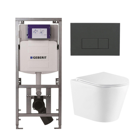 QeramiQ Dely Toiletset - 36.3x51.7cm - diepspoel - rimless - Geberit UP320 inbouwreservoir - softclose toiletzitting - antraciet mat bedieningsplaat - rechtehoekige knoppen - wit glans