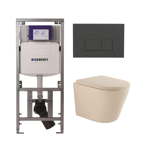 QeramiQ Dely Swirl Toiletset - 36.3x51.7cm - Geberit UP320 inbouwreservoir - 35 mm zitting - antraciet mat bedieningsplaat - rechthoekige knoppen - beige