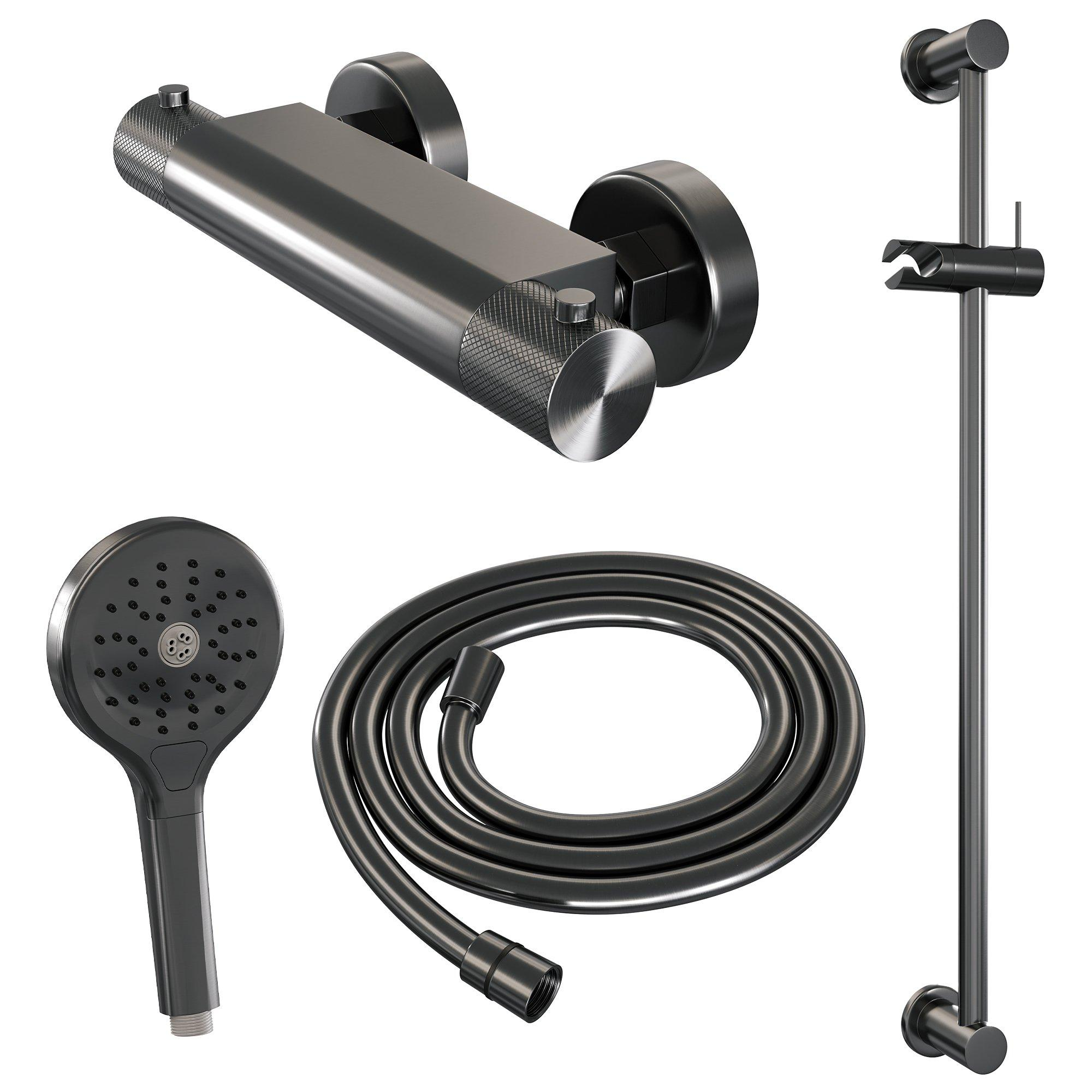 Brauer Gunmetal Carving Douchekraan opbouw - glijstang - 1 functie - 2 carving knoppen - handdouche rond 3 standen - PVD - geborsteld gunmetal