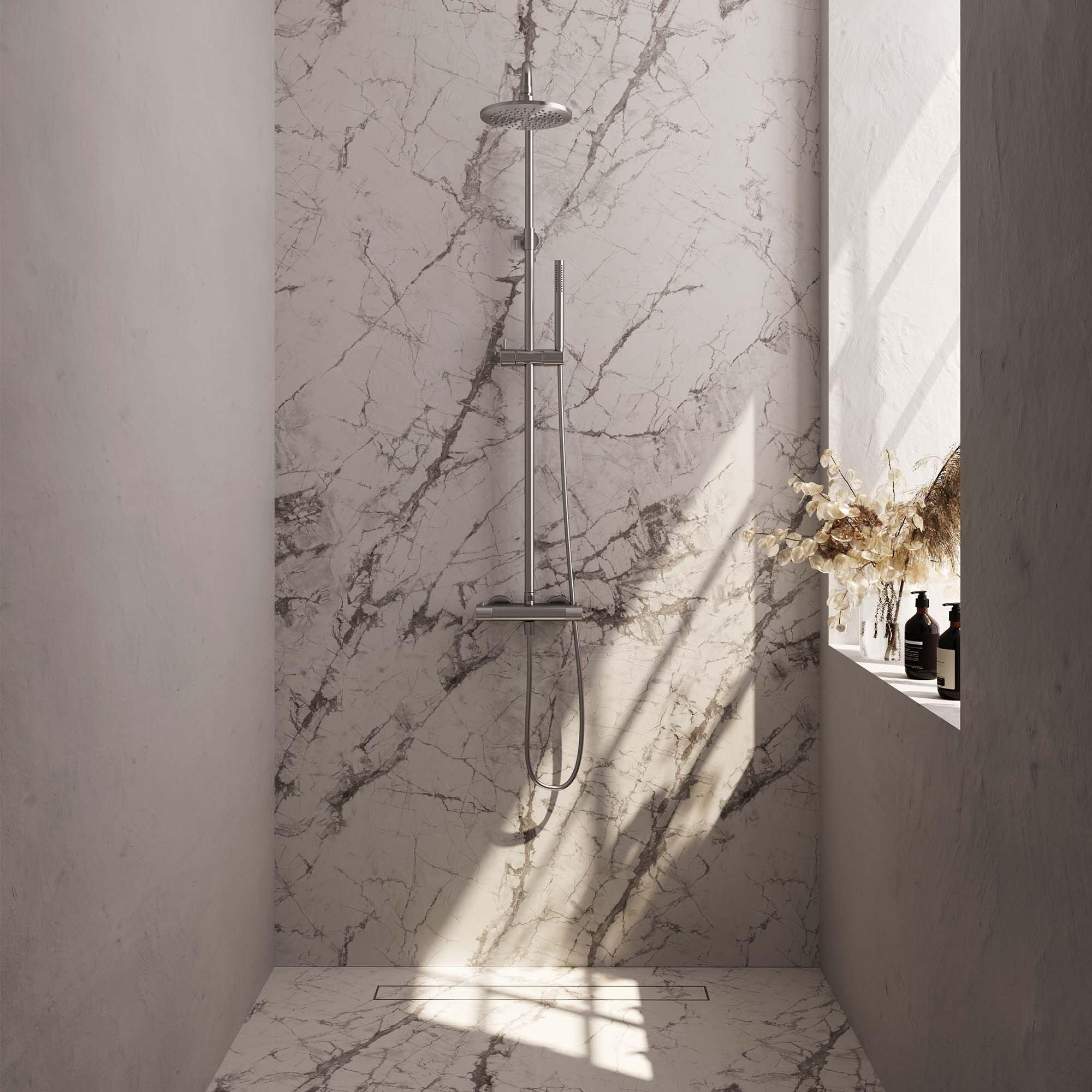 De Brauer Brushed Carving Regendoucheset opbouw straalt stijl uit dankzij het unieke design en de geborsteld RVS afwerking. De carving knoppen voegen een vleugje elegantie toe en zorgen voor een luxueuze uitstraling in de badkamer. Deze doucheset is niet alleen functioneel, maar ook een eyecatcher die de badkamer transformeert tot een spa-achtige omgeving.