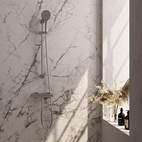 De Brauer Brushed Edition Douchekraan opbouw straalt luxe uit in elke badkameromgeving. Het gebruik van hoogwaardige materialen, zoals roestvrij staal en PVD-coating, garandeert een lange levensduur en uitstekende prestaties. De geborstelde afwerking geeft de kraan een exclusieve uitstraling die klasse en verfijning toevoegt aan de ruimte. Met twee gladde knoppen voor eenvoudige bediening en een handdouche met diverse standen, ervaar je ultiem comfort en luxe tijdens elke douchebeurt.
