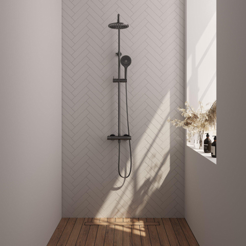 De Brauer Gunmetal Carving Regendoucheset opbouw straalt stijl en elegantie uit in elke badkamer. De geborsteld gunmetal afwerking geeft een moderne twist aan het klassieke ontwerp. De carving knoppen voegen een uniek detail toe, terwijl de strakke lijnen zorgen voor een minimalistische uitstraling. Deze doucheset is niet alleen functioneel, maar ook een prachtige toevoeging aan je badkamerinterieur.