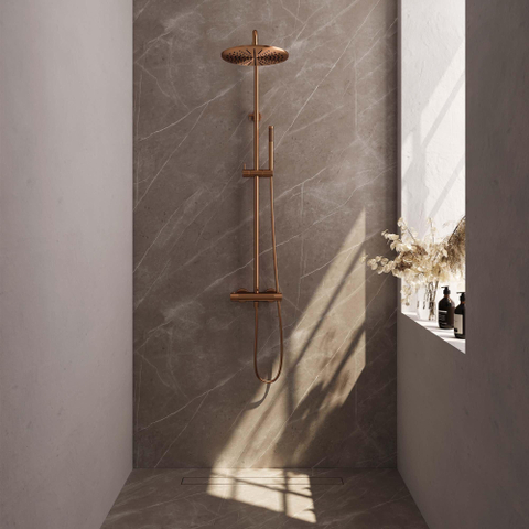 De Brauer Copper Edition Regendoucheset opbouw straalt een tijdloze elegantie uit die elke badkamer verfraait. Het geborsteld koperen design voegt een vleugje warmte toe aan de ruimte en creëert een sfeer van luxe en comfort. Deze doucheset combineert functionaliteit met stijl op een unieke en elegante manier, waardoor het een must-have is voor wie op zoek is naar een verfijnde badkamerervaring.