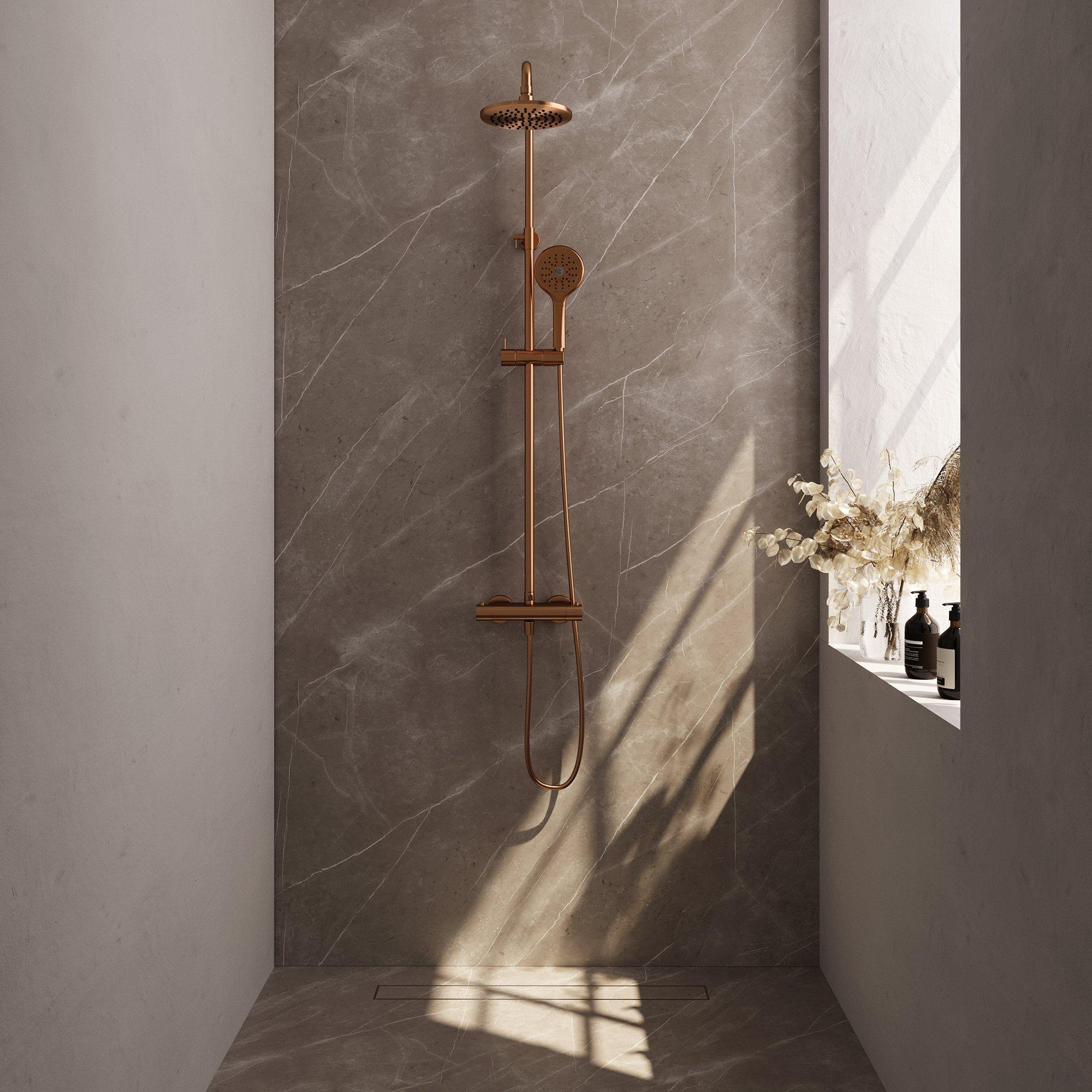 Bekijk een variant in Alkmaar, Amsterdam Amstel, Arnhem, Breda, Middelburg, Nieuwegein, Rosmalen, Rotterdam, Tilburg, WateringenBrauer Copper Edition Regendoucheset opbouw - hoofddouche 20cm - glijstang - handdouche rond 3 standen - gladde knoppen - PVD - geborsteld koper