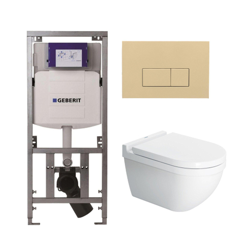 Duravit Starck 3 toiletset met Geberit inbouwreservoir toiletzitting met Saniclass softclose zitting en QeramiQ beige bedieningsplaat met rechthoekige knoppen wit
