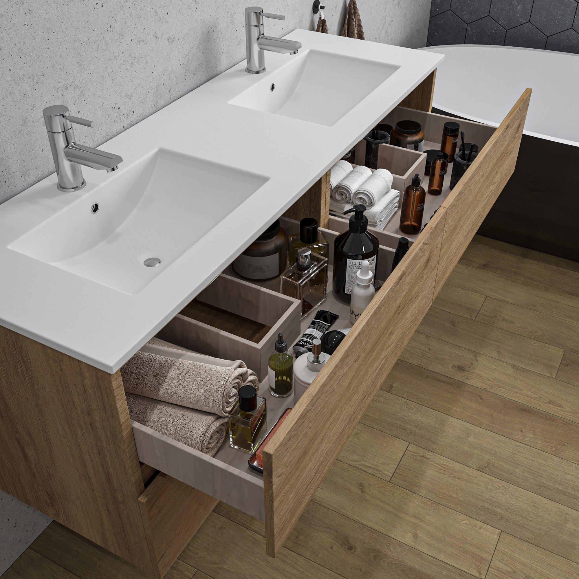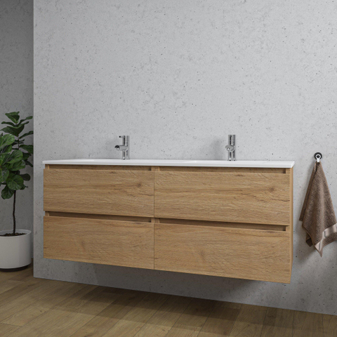 Adema Chaci Badkameronderkast - 140cm - 4 lades - greeploos - wit keramieke wastafel - overloop - 2 wasbakken - 2 kraangaten - eiken