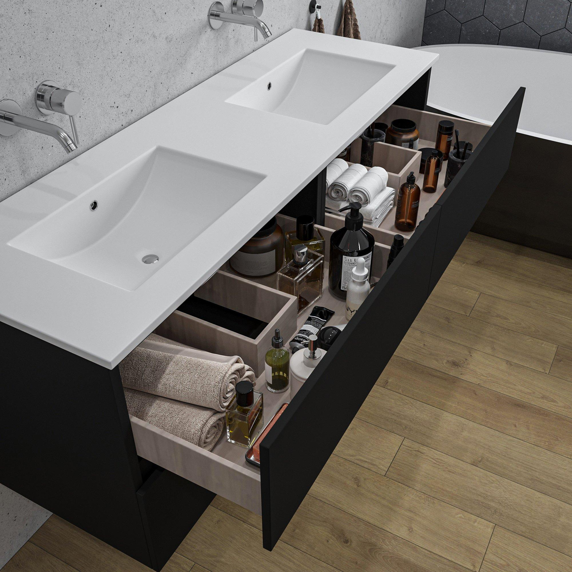 Adema Chaci Badkameronderkast - 140cm - 4 lades - greeploos - wit keramieke wastafel - overloop - 2 wasbakken - zonder kraangaten - mat zwart