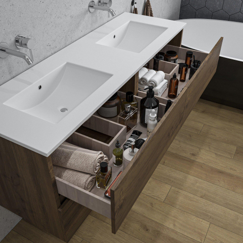 Adema Chaci Badkameronderkast - 140cm - 4 lades - greeploos - wit keramieke wastafel - overloop - 2 wasbakken - zonder kraangaten - noten