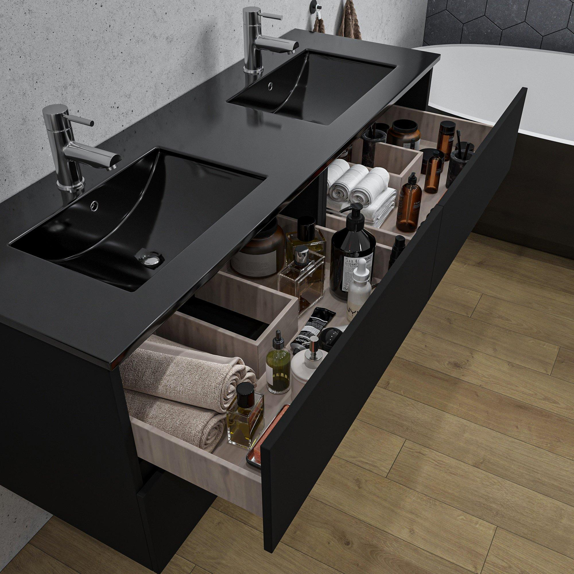 Adema Chaci Badkameronderkast - 140cm - 4 lades - greeploos - zwart keramieke wastafel - overloop - 2 wasbakken - 2 kraangaten - mat zwart