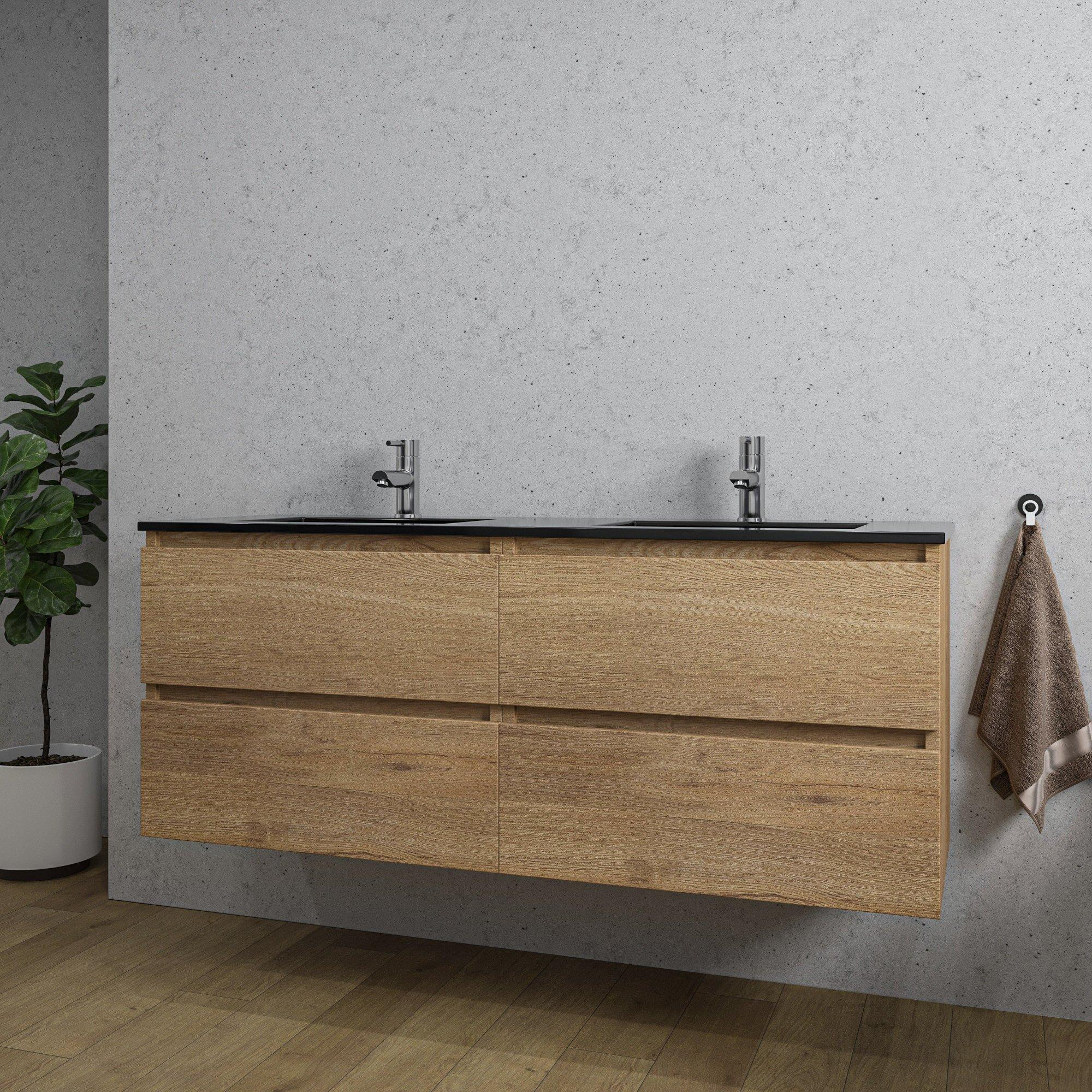 Adema Chaci Badkameronderkast - 140cm - 4 lades - greeploos - zwart keramieke wastafel - overloop - 2 wasbakken - 2 kraangaten - eiken