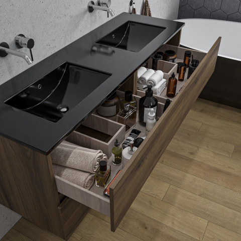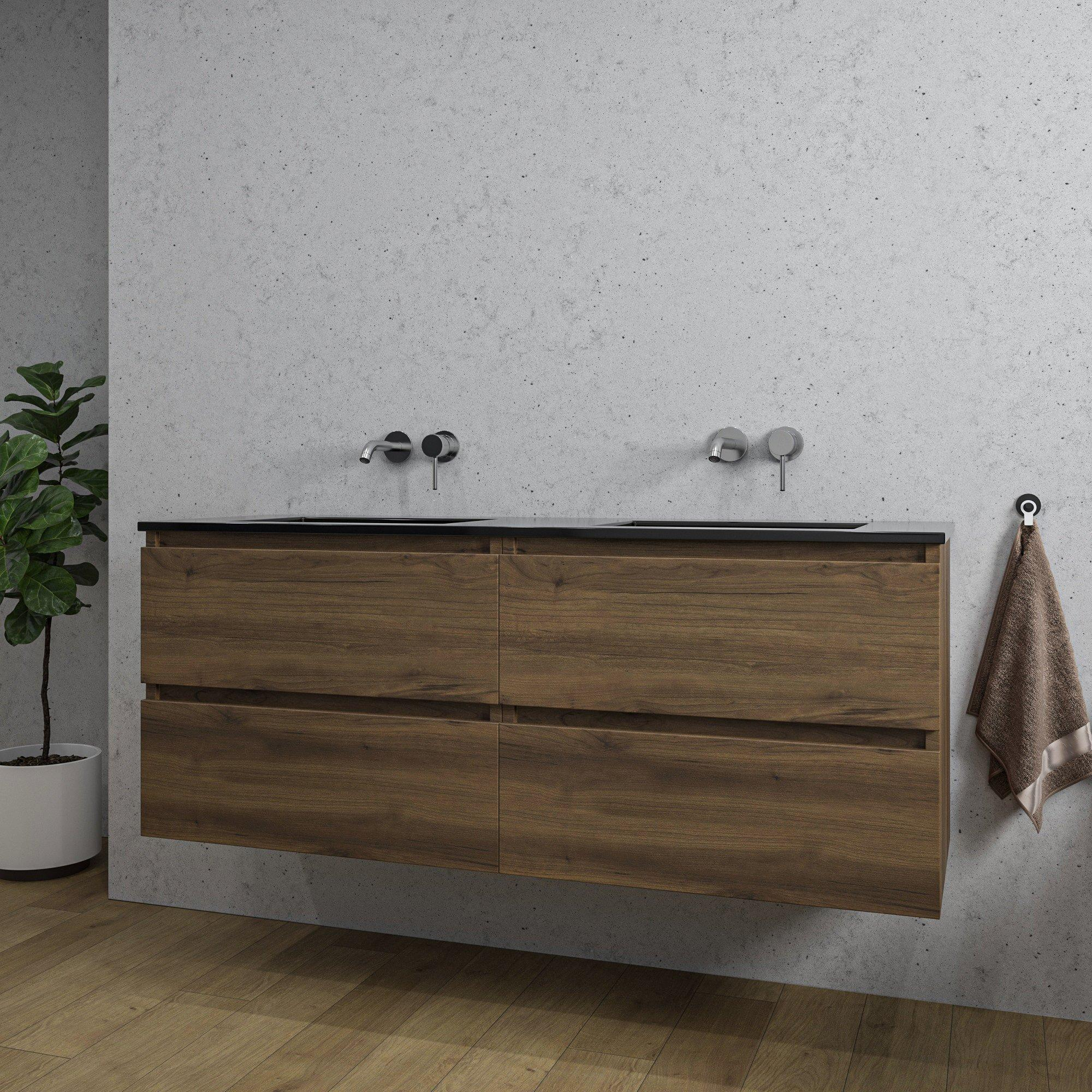 Adema Chaci Badkameronderkast - 140cm - 4 lades - greeploos - zwart keramieke wastafel - overloop - 2 wasbakken - zonder kraangaten - noten