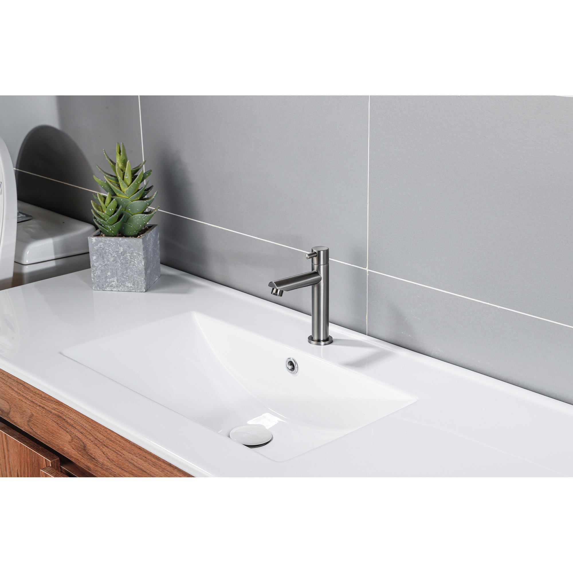 De Fortifura Calvi Fonteinkraan wordt gekenmerkt door zijn moderne ontwerp en strakke lijnen. De combinatie van de opbouwinstallatie en het 1-gats systeem zorgen voor een minimalistische look die perfect past bij eigentijdse badkamerstijlen. De PVD geborsteld gunmetal afwerking voegt een vleugje verfijning toe aan de kraan, waardoor het een statementstuk wordt in de ruimte.