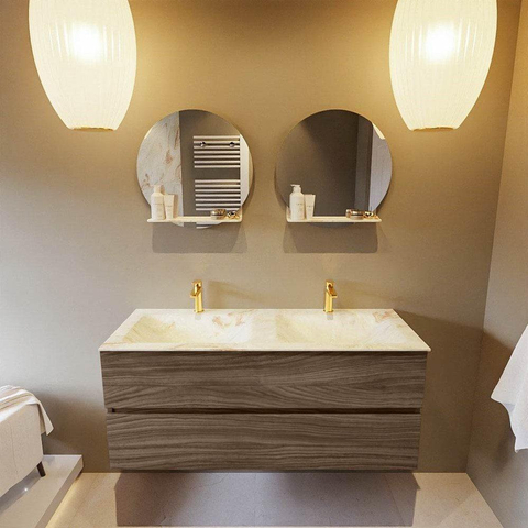 Mondiaz VICA-DLUX 120cm badmeubel onderkast Mocha 2 lades. Inbouw wastafel CLOUD dubbel 2 kraangaten, kleur Frappe.