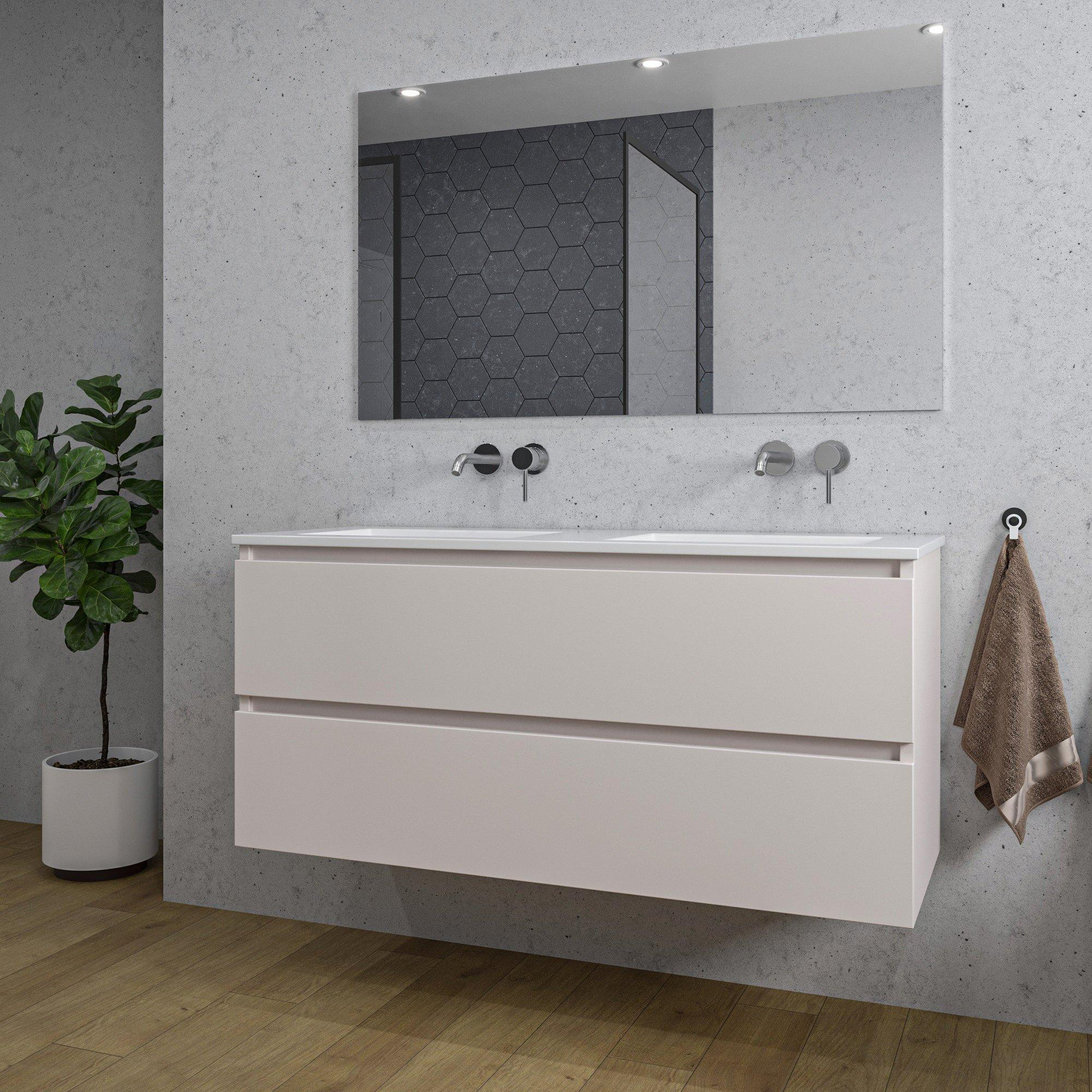 Adema Chaci Badkamermeubelset - 120x46x57cm - 2 keramische wasbakken wit - zonder kraangaten - 2 lades - rechthoekige spiegel - mat cotton (beige)