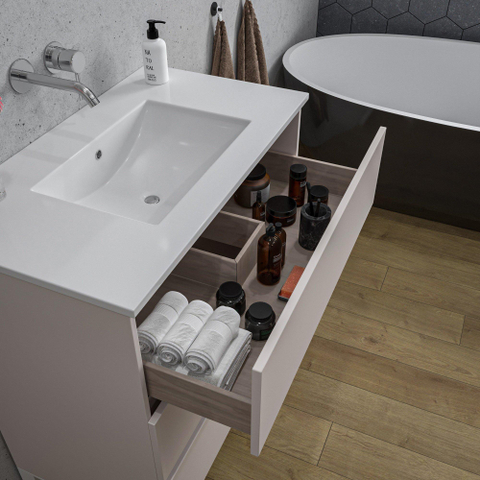 Naast zijn esthetische waarde is dit badkamermeubelset ook zeer functioneel. De keramische wasbak is duurzaam en gemakkelijk schoon te maken, waardoor hij perfect is voor dagelijks gebruik. De drie lades zijn voorzien van soepele rails voor moeiteloos openen en sluiten, terwijl de afwezigheid van kraangaten een strak en opgeruimd uiterlijk creëert. De ruime spiegel biedt niet alleen een reflectie, maar vergroot ook visueel de ruimte, waardoor je badkamer groter en helderder lijkt.