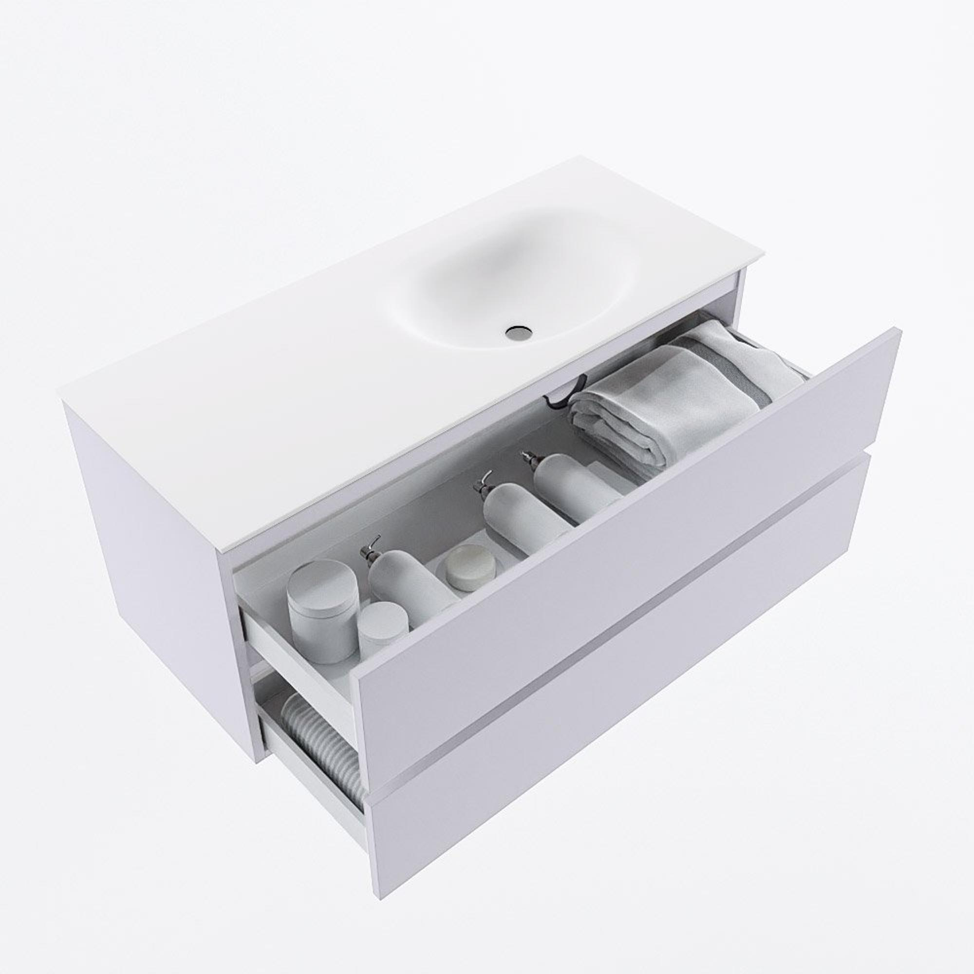Naast zijn esthetische waarde is dit badkamermeubelset ook zeer functioneel. De twee ruime lades bieden voldoende opbergruimte voor al je badkamerbenodigdheden, terwijl de XL versie van de wastafel MOON zorgt voor extra comfort en gebruiksgemak.