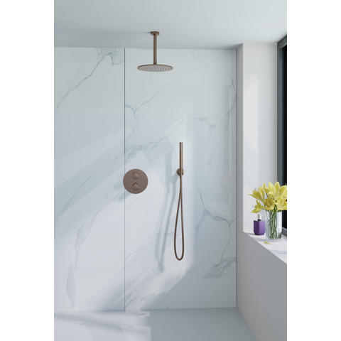 Stap in de ultieme luxe van een verfrissende douche-ervaring met deze prachtige inbouw regendoucheset. Laat je omhullen door een zachte regen van warm water terwijl je geniet van de moderne elegantie die dit product uitstraalt. Met zijn rozetten rond design en thermostatische functie, brengt deze set een vleugje stijl en comfort in jouw badkamer. De 25cm hoofddouche en staaf handdouche zorgen voor een veelzijdige en ontspannende douche-ervaring. Het geborsteld koper PVD (Koper) voegt een vleugje warmte en verfijning toe aan elke badkamer.