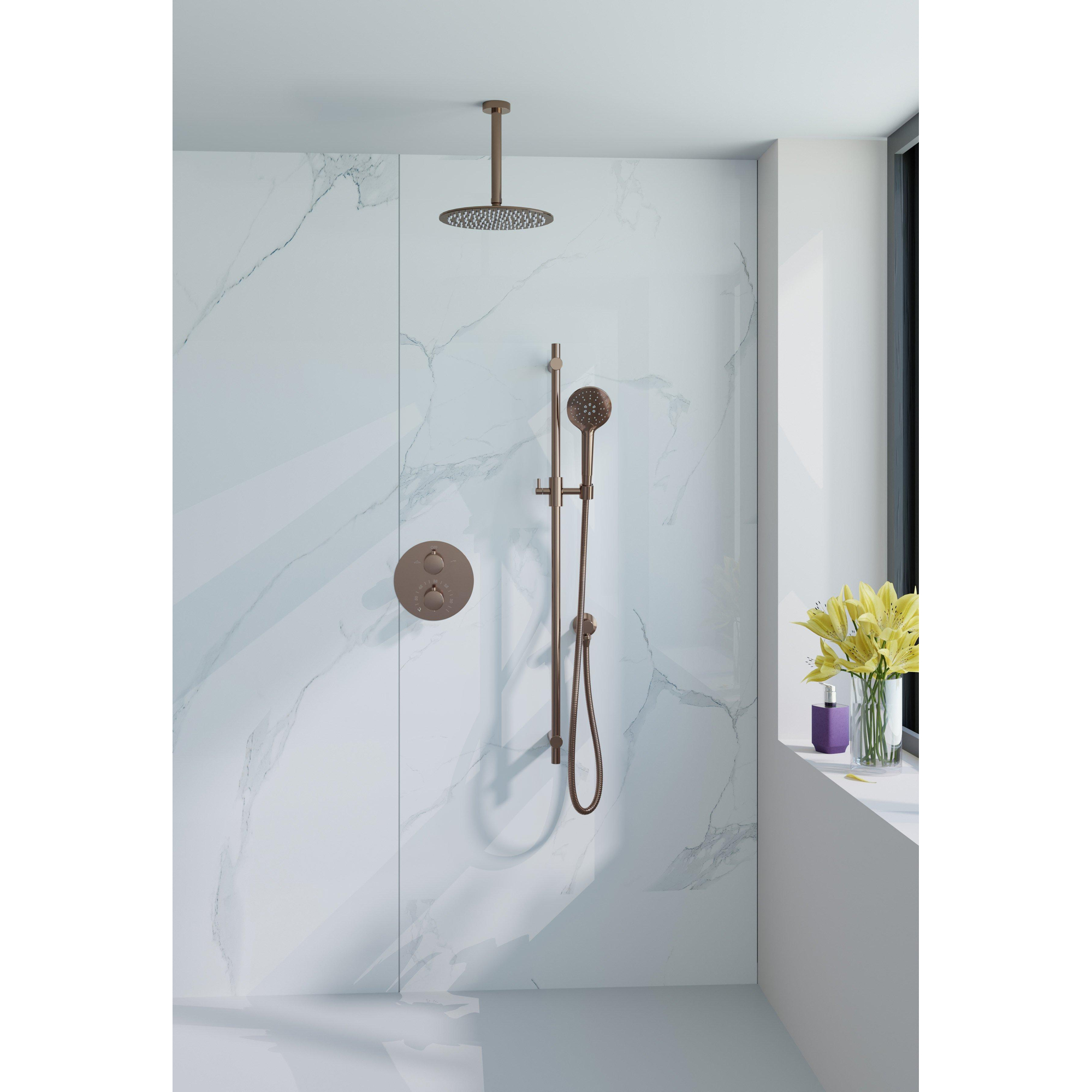 Met een geborsteld koperen PVD-afwerking straalt deze regendoucheset een tijdloze elegantie en verfijning uit die je badkamer een vleugje glamour geeft. De 25cm hoofddouche en ronde handdouche combineren moeiteloos vorm en functie, waardoor je dagelijkse routine wordt getransformeerd in een chique en stijlvolle ervaring.