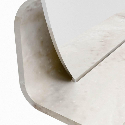 Het planchet, met zijn vloeiend afgeronde hoeken, biedt handige opbergruimte voor uw dagelijkse benodigdheden. De spiegel is subtiel verzonken in het planchet, wat zorgt voor een moderne en stijlvolle uitstraling.