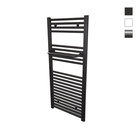 De beugelvorm is duidelijk zichtbaar en deze vormgeving geeft optimaal gebruiksgemak. Deze beugel is echt over de gehele breedte plus zijdes bruikbaar! Hij is leverbaar in het chroom, wit en mat zwart, waardoor hij eenvoudig te combineren is met diverse kleuren radiatoren. Hij is leverbaar in 35 en 50 cm breed en dus geschikt voor de reguliere radiatoren als wel voor de smallere uitvoeringen. Afmeting: 50 cm Kleur: mat zwart In de badkamer is een handdoekhouder bij uw radiator onmisbaar. Een handdoekhouder kan op de radiator geplaatst worden en neemt niet veel ruimte in beslag. De combinatie van een handdoekradiator met een handdoekhouder is ideaal. De handdoekradiator zorgt ervoor dat uw handdoek lekker warm is voor gebruik. Aan de handdoekhouder kunt u gemakkelijk uw natte handdoek laten drogen. Natte handdoeken rechtstreeks over een handdoekradiator hangen verminderd namelijk de warmteafgifte en daardoor wordt er veel energie verspild. Tegelijk zal de badkamer koud blijven, want de warmte wordt tegengehouden door de natte handdoek(ken). Ook kunnen natte handdoeken in combinatie met zeepresten e.d. op den duur ervoor zorgen dat de radiator op die plekken zal gaan roesten. "