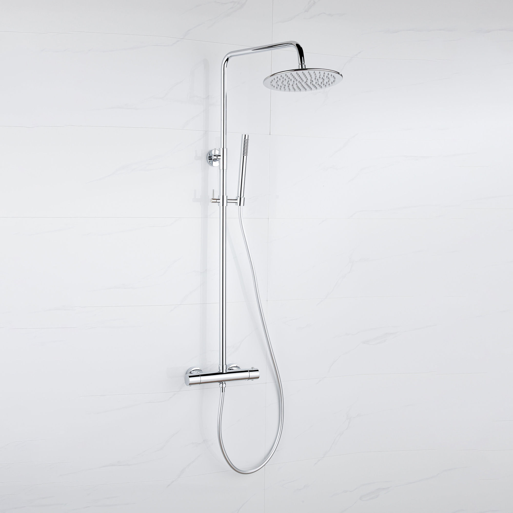 Naast zijn prachtige uiterlijk is deze doucheset ook zeer functioneel. De thermostatische regeling zorgt voor een constante watertemperatuur en voorkomt plotselinge temperatuurschommelingen. De 25cm hoofddouche zorgt voor een gelijkmatige waterverdeling, terwijl de gladde slang en staaf handdouche zorgen voor extra flexibiliteit en gemak tijdens het douchen. Met deze set geniet je van ultiem comfort en gebruiksgemak.