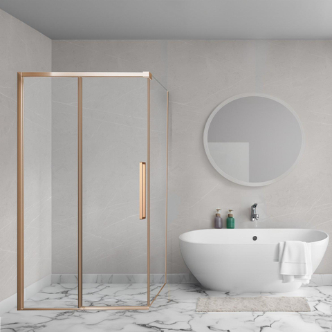 Stap in de wereld van luxe en stijl met deze prachtige zijwand voor in de badkamer. Met zijn elegante design en hoogwaardige afwerking brengt dit product een vleugje verfijning in jouw badkamerinterieur. Laat je betoveren door de schittering van geborsteld koper en geniet van een unieke sfeer van klasse en comfort.