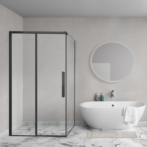 Ervaar de ultieme elegantie met deze zijwand van Aqua Vista. De zwarte matte afwerking voegt een vleugje stijl toe aan je badkamerinterieur. De strakke lijnen en het moderne ontwerp creëren een verfijnde uitstraling die elke badkamer transformeert tot een oase van rust en luxe.