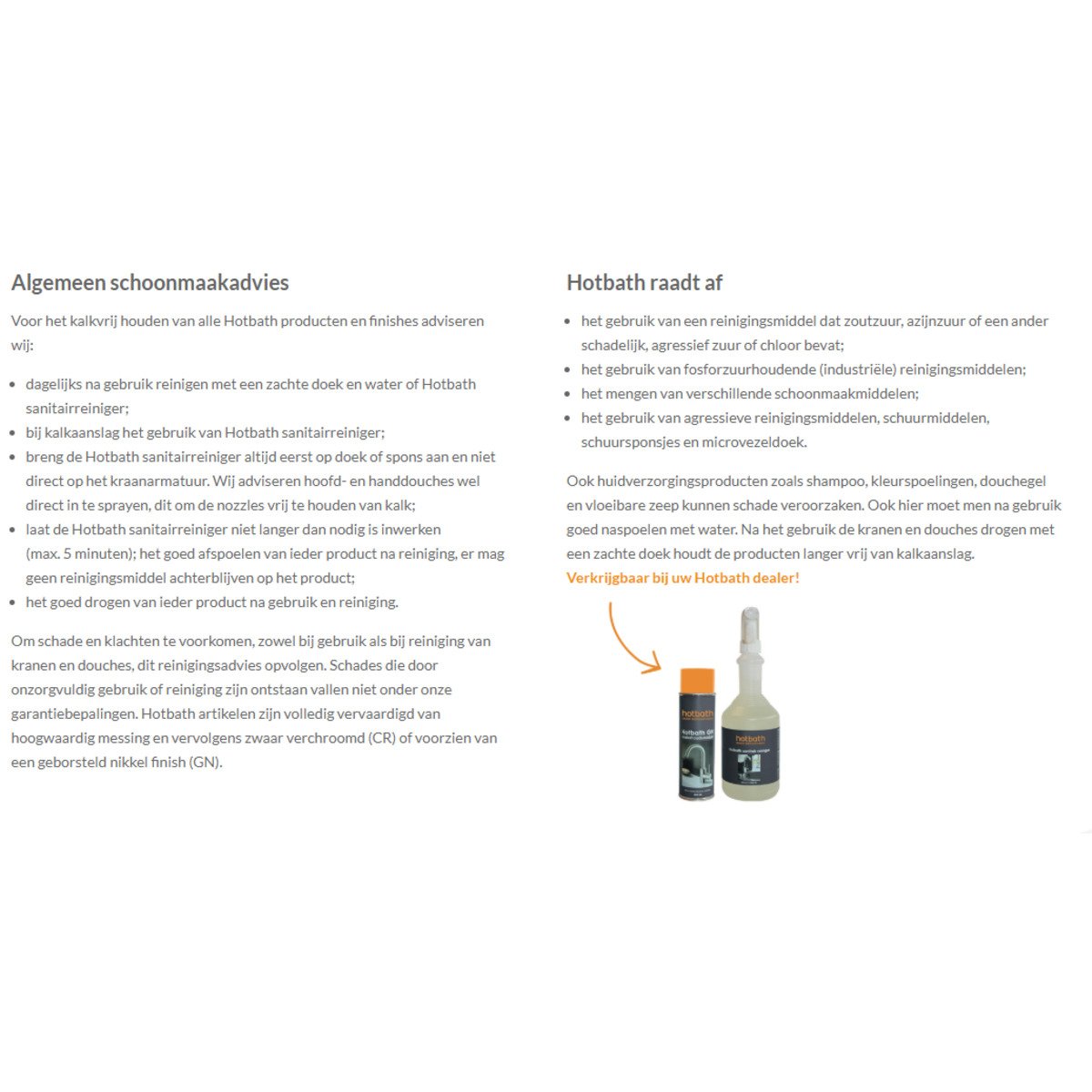 Om schade en klachten te voorkomen, zowel bij gebruik als bij reiniging van kranen en douches, dit reinigingsadvies opvolgen. Schades die door onzorgvuldig gebruik of reiniging zijn ontstaan vallen niet onder onze garantiebepalingen. Hotbath artikelen zijn volledig vervaardigd van hoogwaardig messing en vervolgens zwaar verchroomd (CR) of voorzien van een geborsteld nikkel finish (GN).