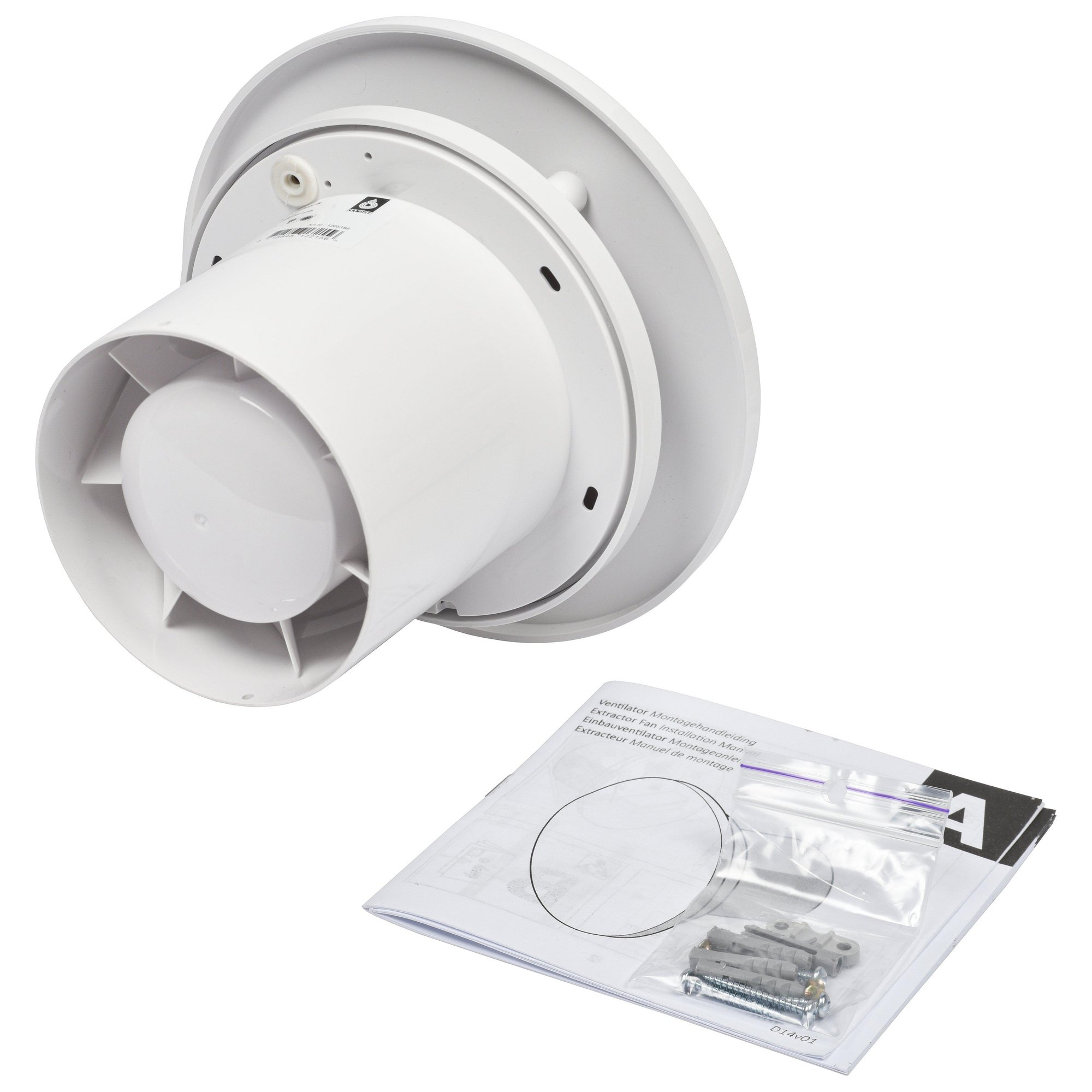 Sanivesk Ventilator Design Rond Ø100mm Timer Vochts Wit CEInbouwventilator 100mm geschikt voor wand- en plafondmontage voor ruimtes tot 10m2. Door de kogelgelagerde motor is deze ventilator ook verticaal te plaatsen.