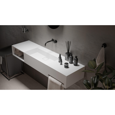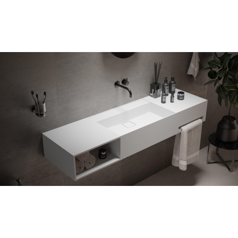 Ideavit Wastafel - 140x40x20cm - solid surface - afgeronde binnenhoeken - handdoekhouder rechts - opbergvak links - vierkante afvoerdekking - solid surface - mat wit