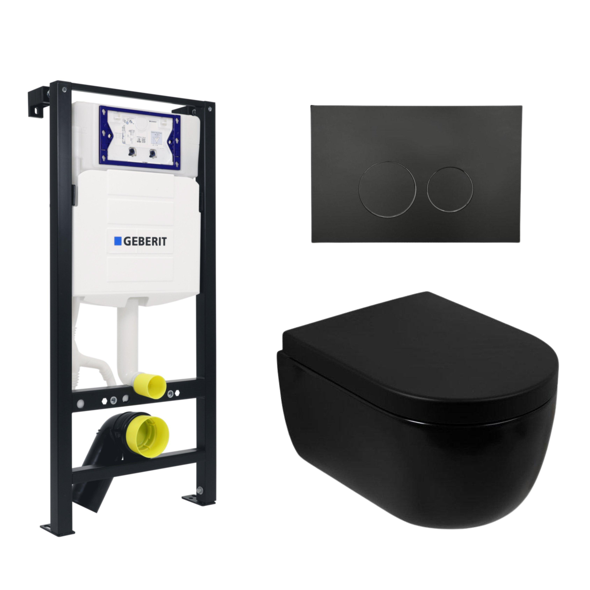 Plieger Kansas Toiletset - UP320 inbouwreservoir - wandcloset - compact - zitting - softclose - mat zwarte bedieningsplaat - ronde knoppen - mat zwart