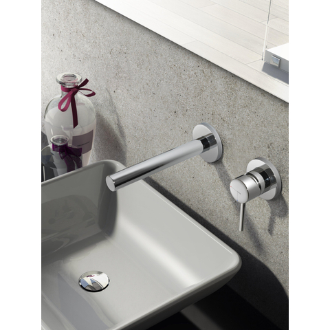 De uitloop en greep worden apart van elkaar in de muur gemonteerd. Je kiest zelf of je de greep links of rechts naast de uitloop wilt plaatsen, of erboven. Met de greep bedien je warm en koud water.
