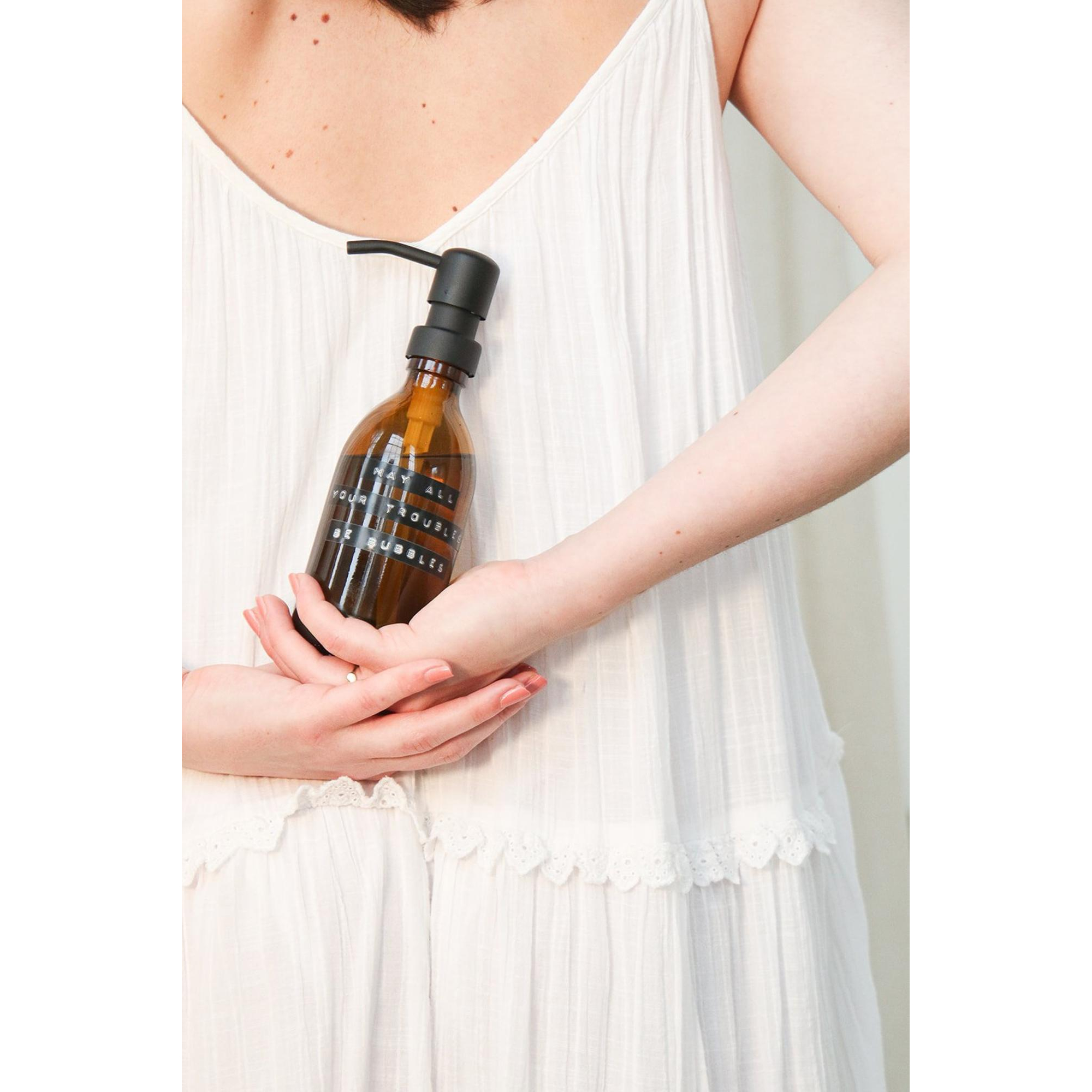 Wellmark Handzeep bruin glas zwarte pomp 250ml tekst MAY ALL YOUR TROUBLES BE BUBBLES Zwart label SHOWROOMMODEL