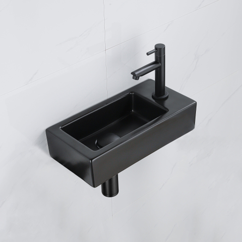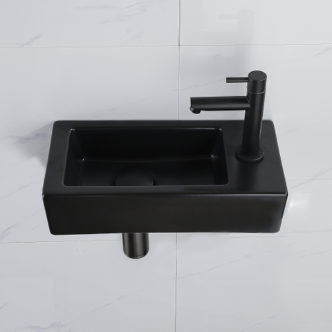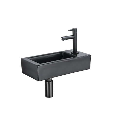 QeramiQ Fuente Fonteinset - 37.5x18.5x9cm - keramiek - kraangat rechts - fonteinkraan zwart mat - afvoerplug - verlaagd sifon - Mat Zwart