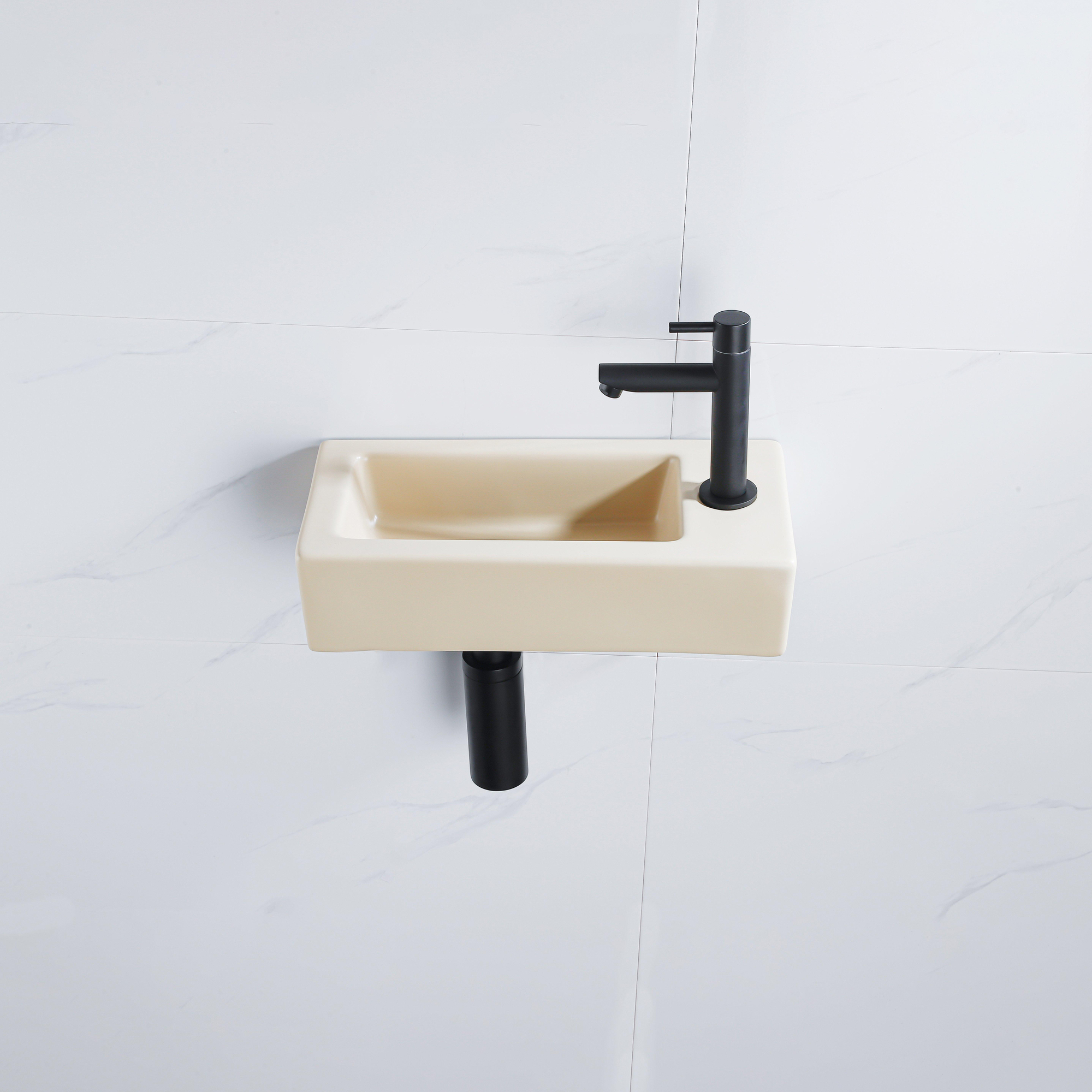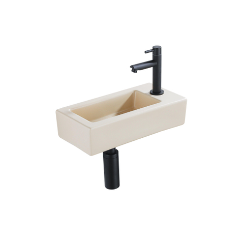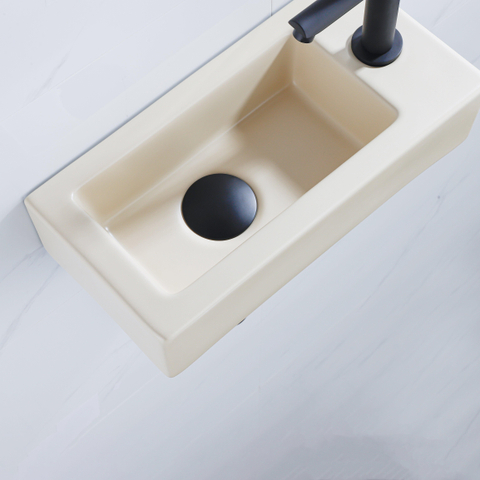 QeramiQ Fuente Fonteinset - 37.5x18.5x9cm - keramiek - kraangat rechts - fonteinkraan zwart mat - afvoerplug - verlaagd sifon - Mat Beige