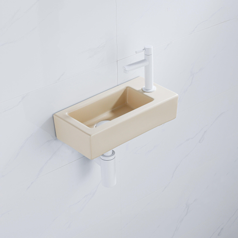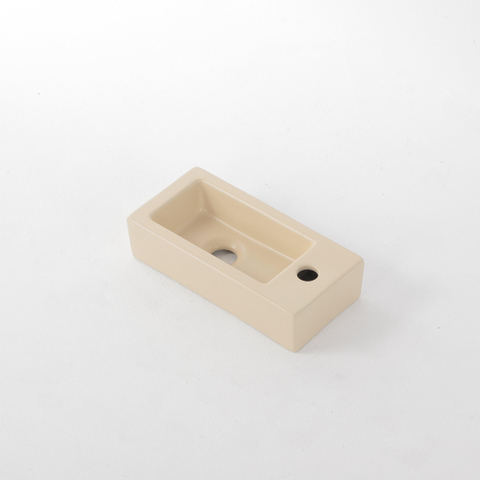 QeramiQ Fuente Fonteinset - 37.5x18.5x9cm - keramiek - kraangat rechts - fonteinkraan mat wit - afvoerplug - verlaagd sifon - Mat Beige
