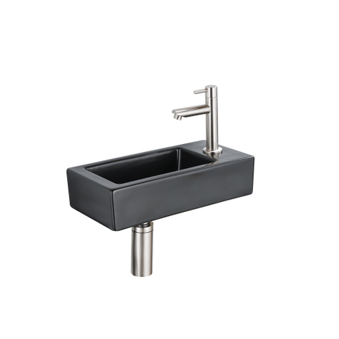 QeramiQ Fuente Fonteinset - 37.5x18.5x9cm - keramiek - kraangat rechts - fonteinkraan geborsteld RVS - afvoerplug - verlaagd sifon - Mat Zwart