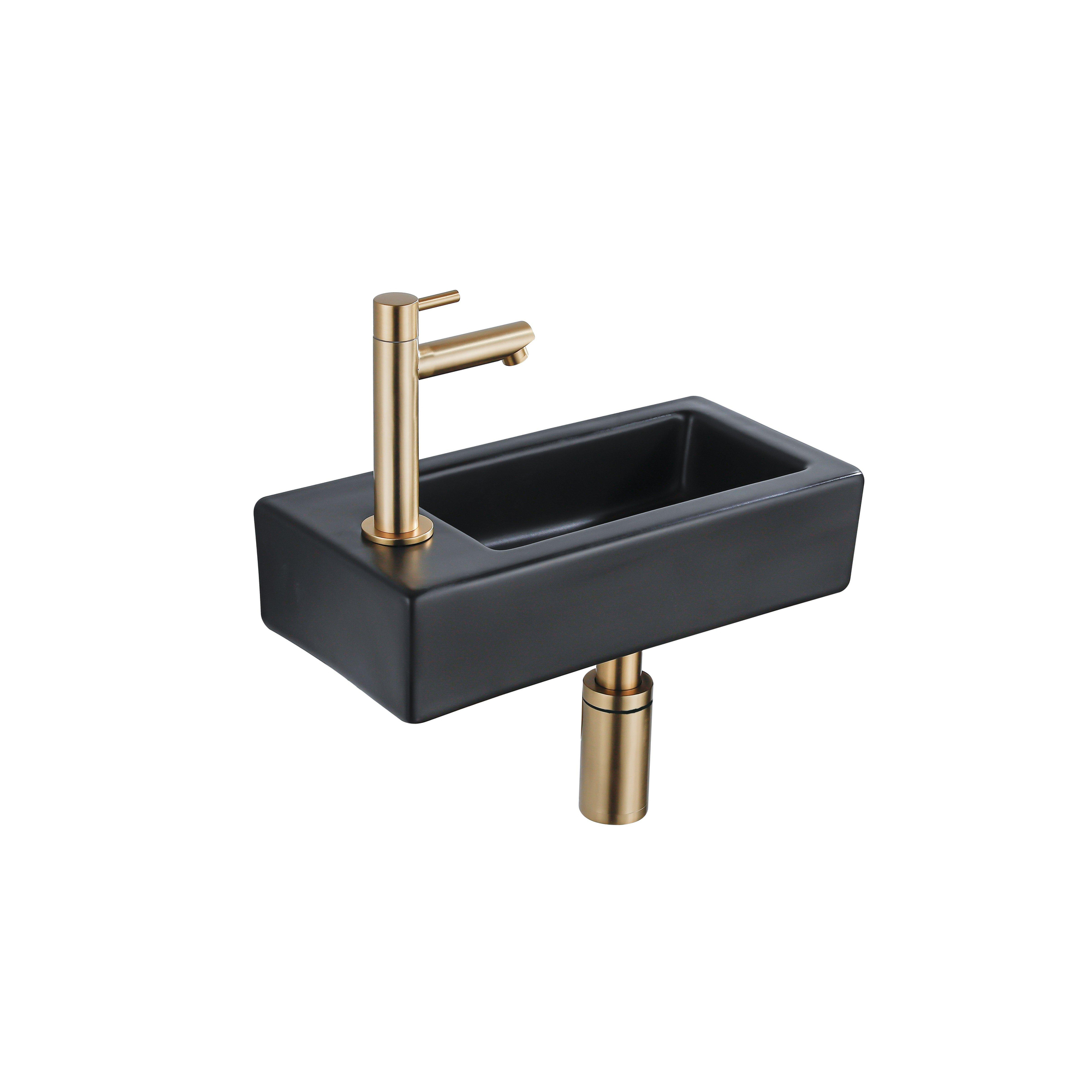 QeramiQ Fuente Fonteinset - 37.5x18.5x9cm - keramiek - kraangat links - fonteinkraan geborsteld messing - afvoerplug - verlaagd sifon - Mat Zwart