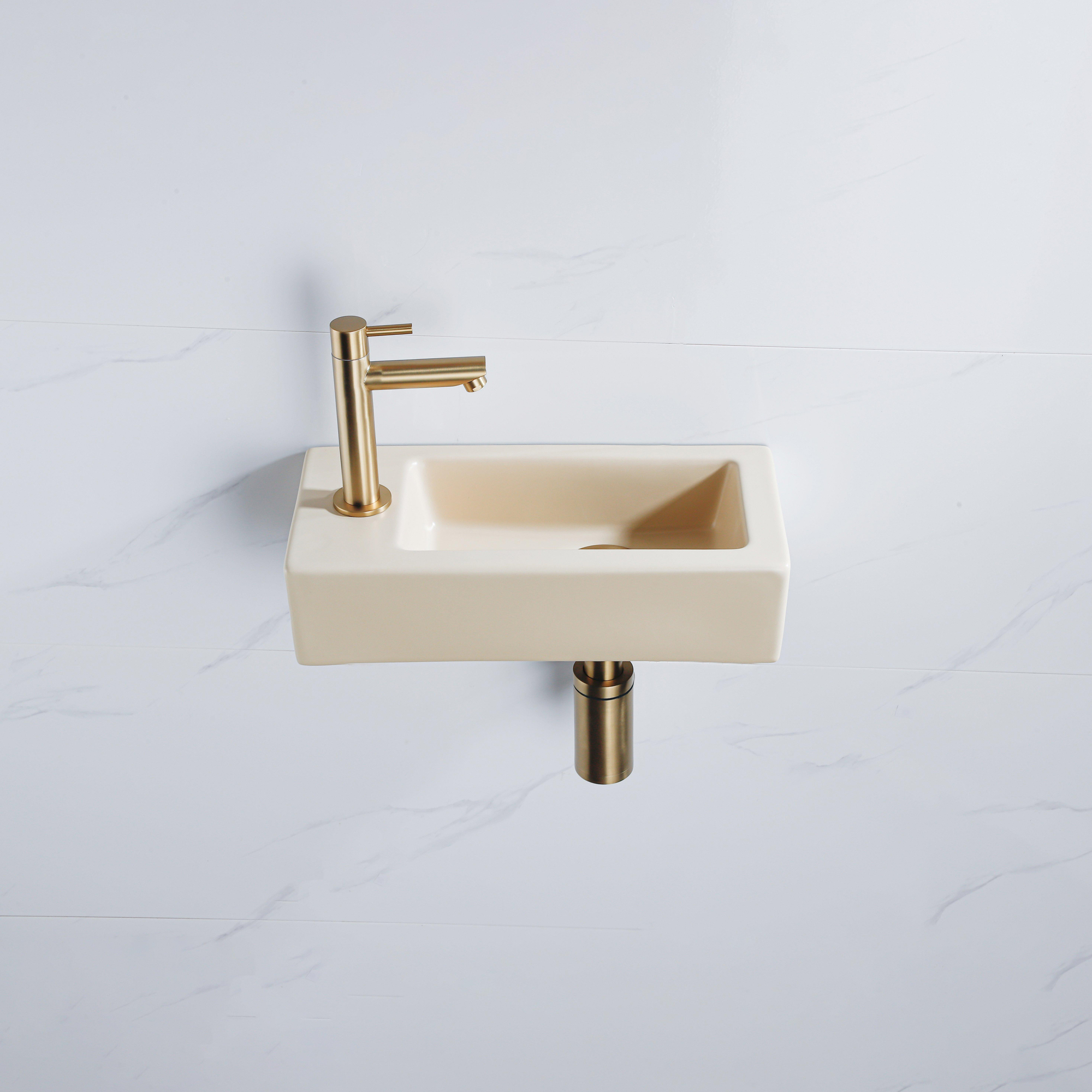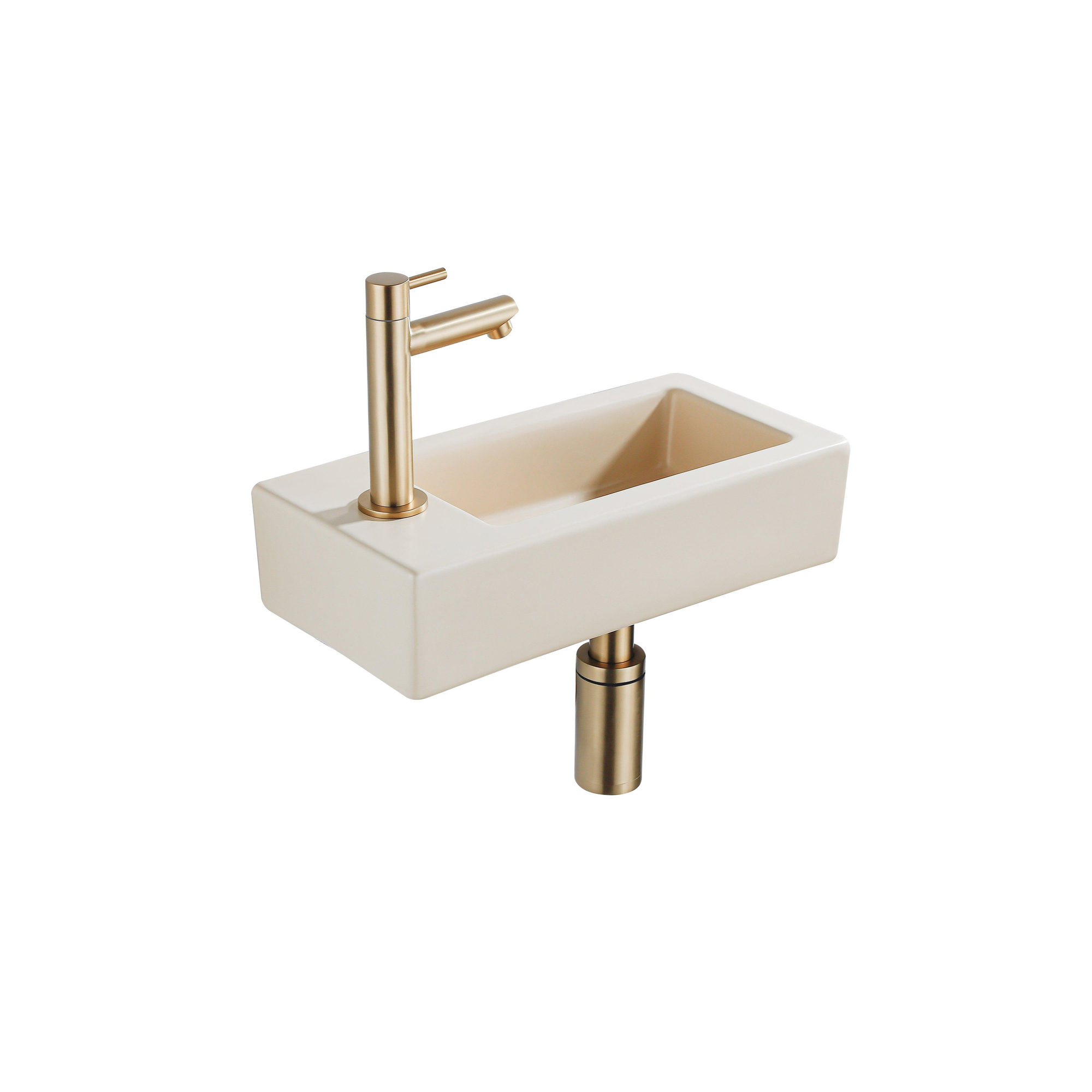 QeramiQ Fuente Fonteinset - 37.5x18.5x9cm - keramiek - kraangat links - fonteinkraan geborsteld messing - afvoerplug - verlaagd sifon - Mat Beige