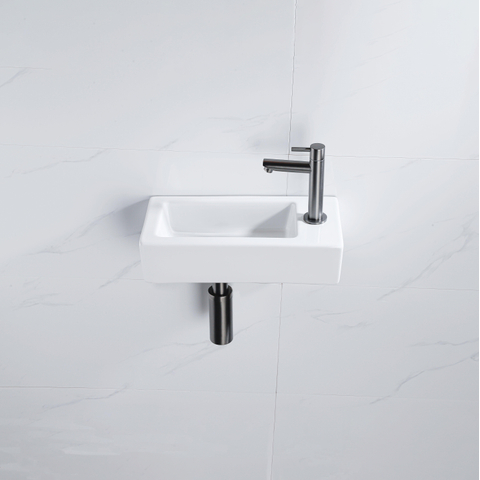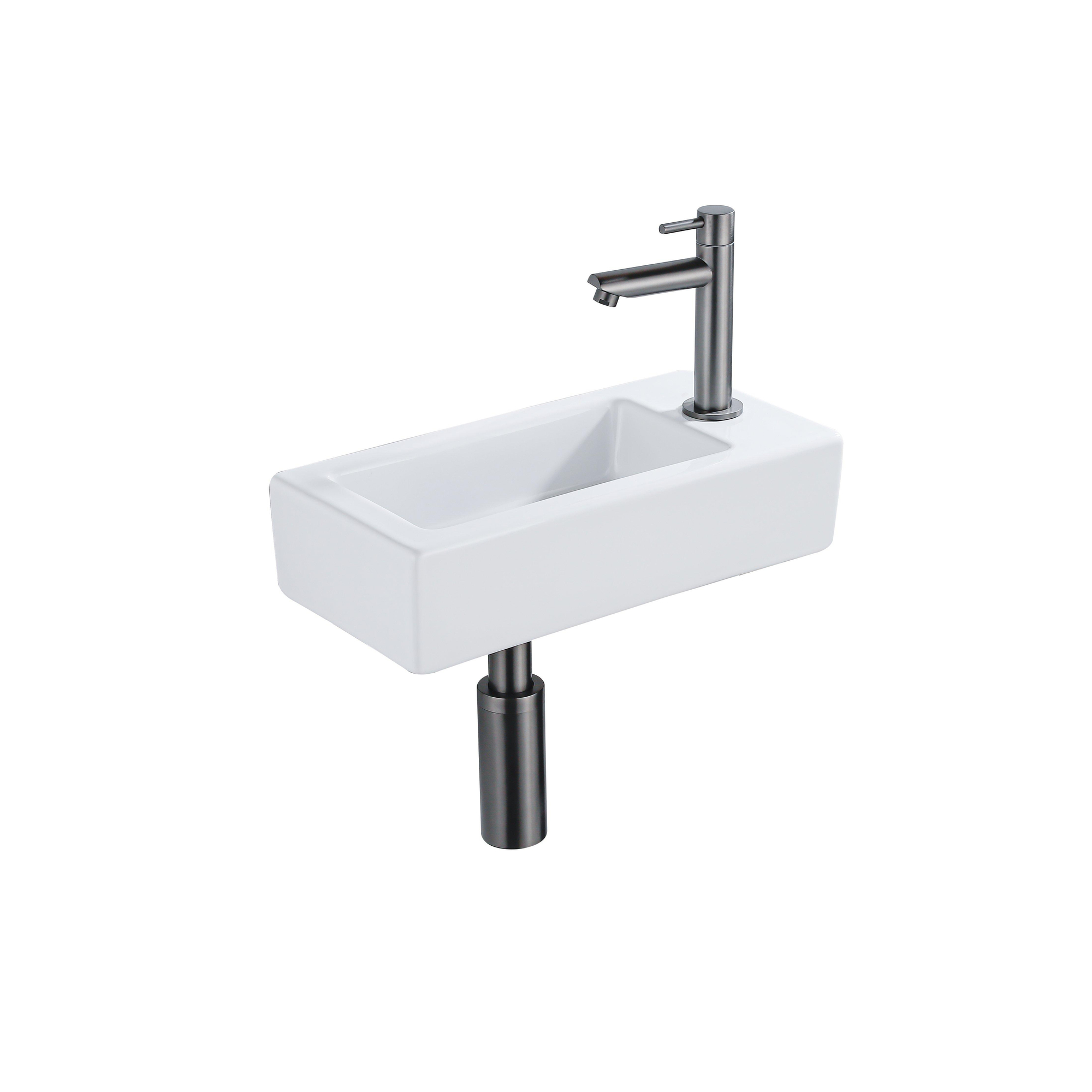 QeramiQ Fuente Fonteinset - 37.5x18.5x9cm - keramiek - kraangat rechts - fonteinkraan gunmetal - afvoerplug - verlaagd sifon - Glans wit