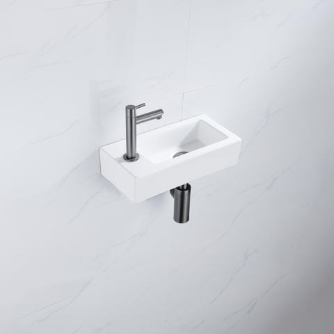 Het moderne design van de QeramiQ Fuente Fonteinset wordt benadrukt door het kraangat aan de linkerkant en de fonteinkraan in gunmetal afwerking. Deze eigentijdse details voegen een vleugje luxe toe aan de badkamer en zorgen voor een verfijnde uitstraling die indruk maakt.